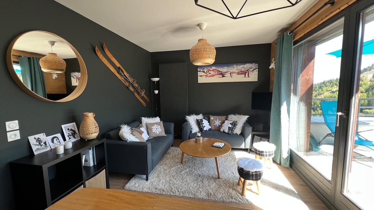 Dans la station de la Plagne-les Coches, vue sur le Mont Blanc. Magnifique appartement tout confort 2 pièces + mezzanine dans une résidence avec piscine couverte gratuite ouverte de mi décembre à mi avril et juillet/août + espace de détente (sauna et hammam). Terrasse de 16m2 pour profiter de la vue et de la montagne été comme hiver. Idéal pour une famille car situé dans un chalet à 150m de la place principale et du départ télésiège Plan Bois (départ cours ESF).