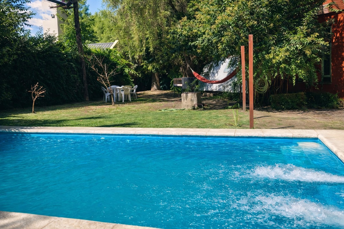 Relájate en este espacio tranquilo, campestre y elegante dentro de 1/2 hectárea arbolada con piscina. Calefacción con losa radiante y salamandra. Sillas de jardin y hamacas paraguayas. Fogonero y parrilla para disfrutar en familia. Cómodas habitaciones con gran iluminación y enchufes USB. Ambientes independientes para un gran descanso. A 5' del Country de Estudiantes, 25' del Estadio Único La Plata. La leña que se encuentra en el parque es de la propiedad, no apto uso salvo permiso del dueño.