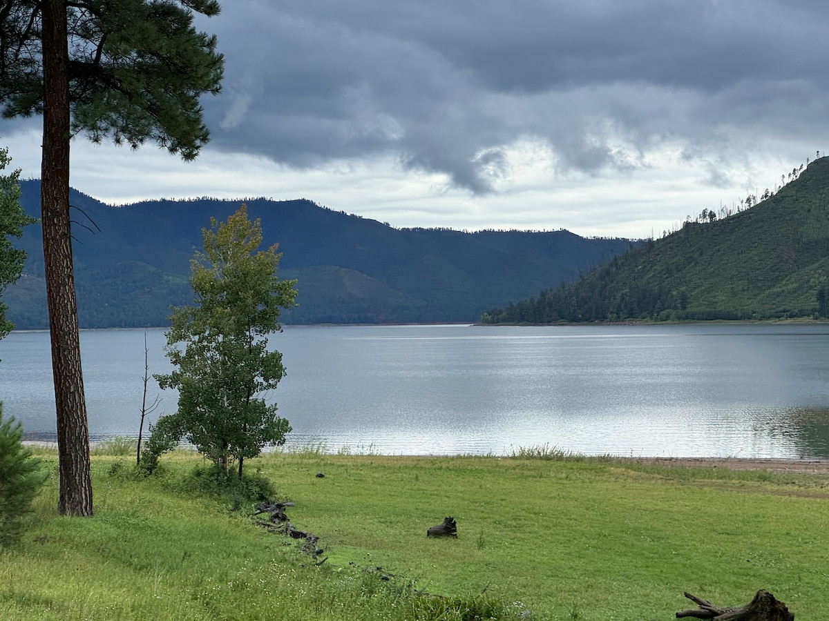 A cute cabin with an ideal location. It is easy to find, and it is just off the county road with plenty of parking space. Vallecito Lake is directly across the street as well as the boat marina where you can rent a pontoon, kayak, paddle board, and more. The front porch offers beautiful views of the mountain and lake, and you can also enjoy the lakeside view from the dining table. Durango is about 25 minutes from Durango during the summer and about 35 to 40 min during the winter.