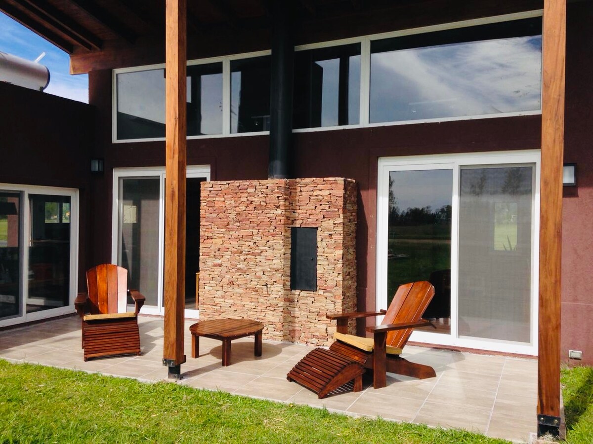 Modern country house in La Escondida (Area 60, 45 min from Buenos Aires). Ground floor with integrated kitchen-dining-living area, guest toilet, laundry and office with sofa bed, bathroom and walk-in closet. Upstairs: 3 bedrooms (master en suite with jacuzzi), space gym/game room and full bathroom. Large garden with firepit, gallery for 12, grill, pool with solarium and bathroom. Gated community with golf, tennis, spa, pool, gym, clubhouse and 24/7 security.
