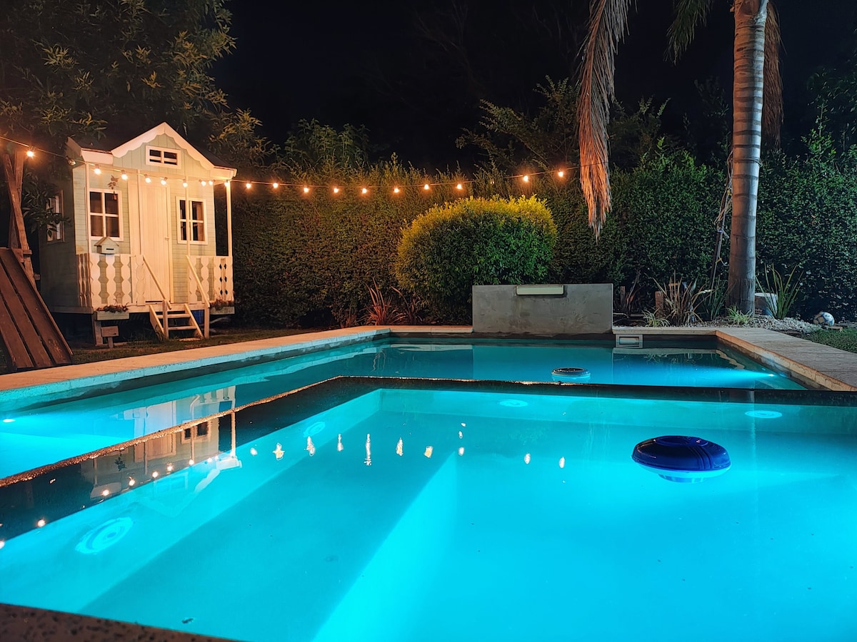 带泳池、烧烤架和大型公园的五人房