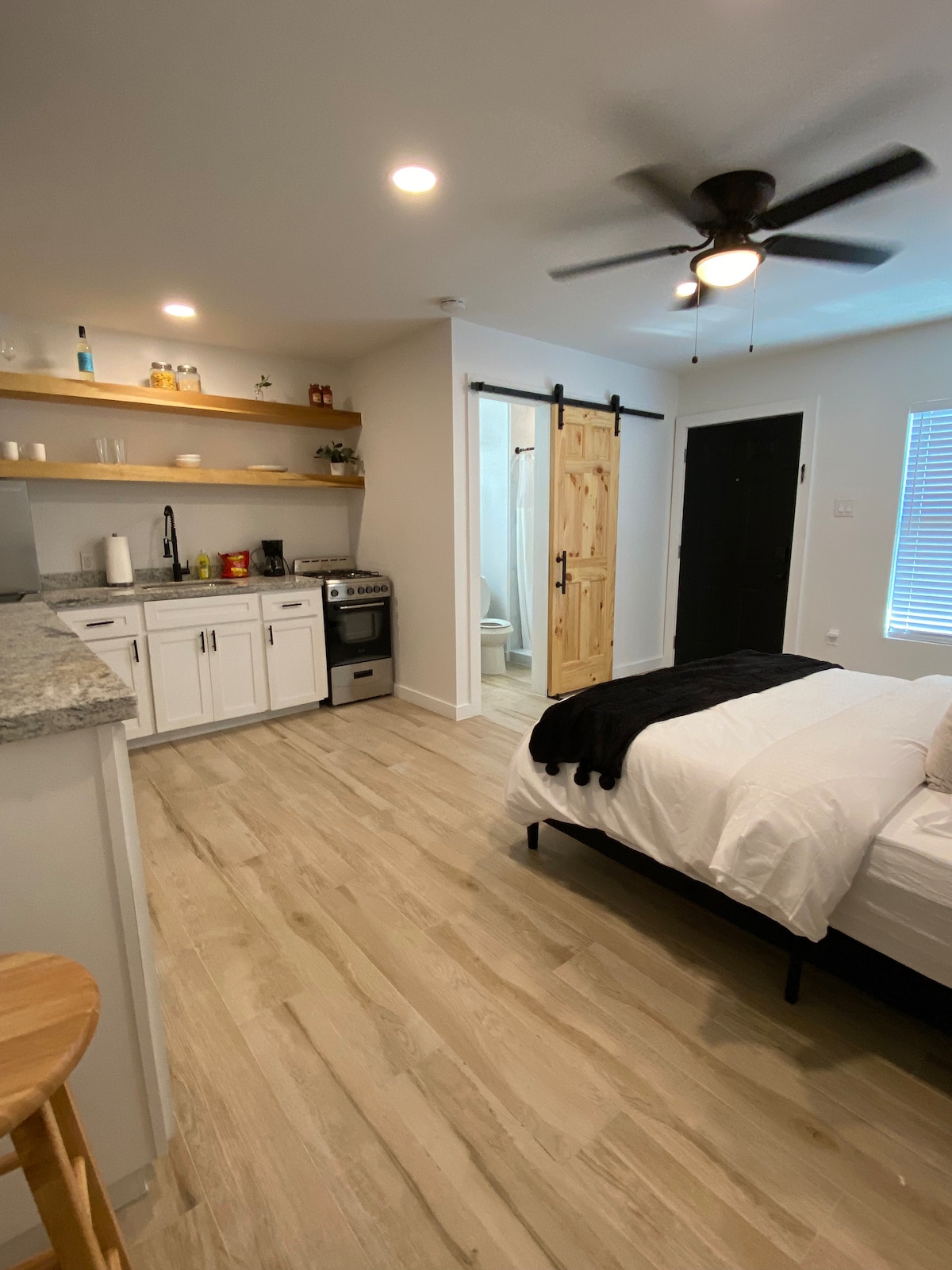 Experience the convenience high-speed WiFi in this charming studio apartment that feels like your home away from home. Here's what we have in store for you: - A well-appointed bathroom with a full shower. - A comfortable bedroom area featuring a queen-size bed. - A fully equipped kitchen and a welcoming dining table. - A cozy living room space. - Complete access to a TV for your entertainment. Your own private patio, complete with a BBQ grill and outdoor furniture, for your exclusive enjoyment.