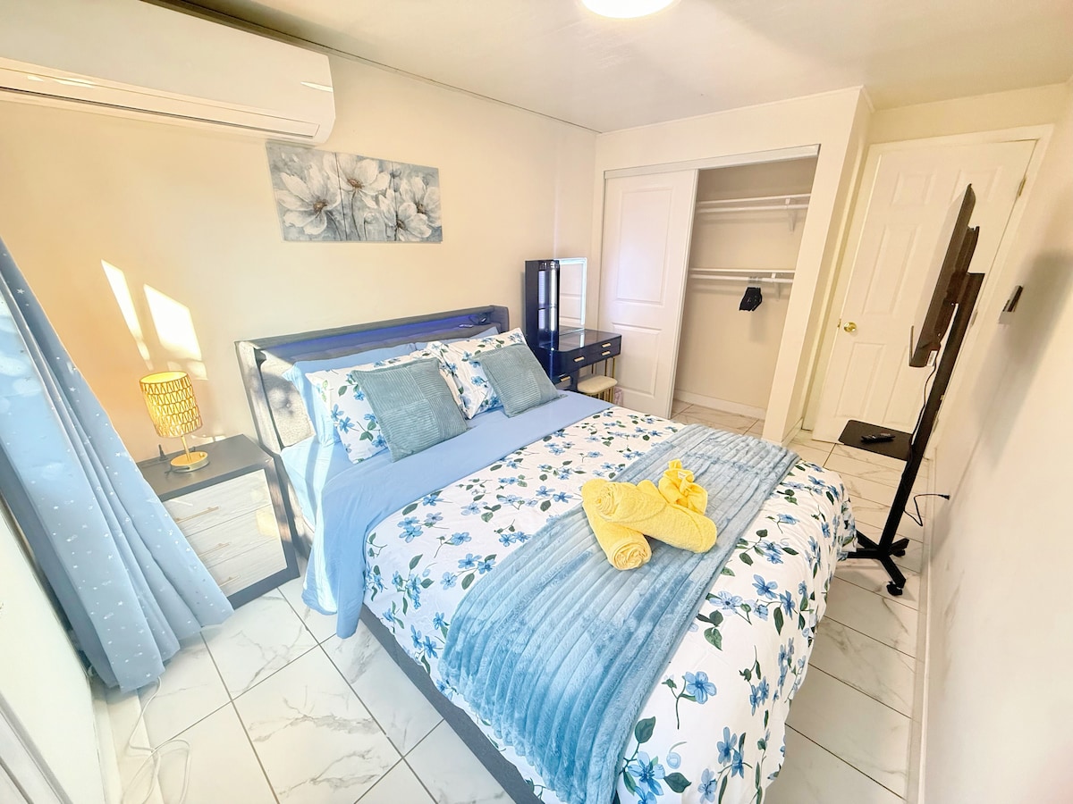 Completely remodeled, stylist and super spacious (1,350sq ft) stylist 2 Bedrooms, 1 newly remodeled restroom with Rain Shower. Spacious Master with King Bed and 2nd with Queen Bed, both white luxurious bedding. Unit comes with all air-fryer, rice cooker, K-cup coffee machine, and everything you will need. 75-inch smart TV. Fast Fiber Internet 500mbs.
