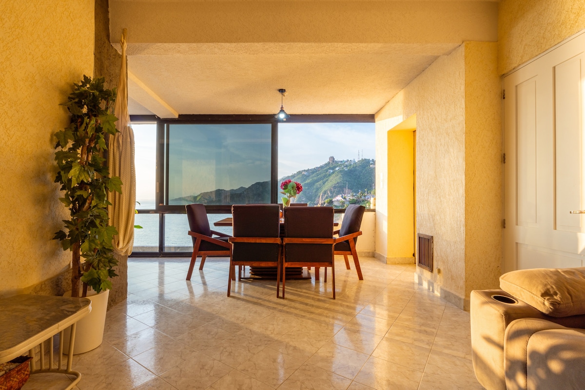 Departamento ubicado en los acantilados, frente a la quebrada, podrás ver la puesta de sol desde su amplia terraza, relajarte en en el jacuzzi o desayunar frente al mar, disfrutarás tu estancia con comodidad, amplitud y bellos atardeceres, en un ambiente contemporáneo y lleno de luz , en el bello Acapulco tradicional, muy cerca de la quebrada, restaurantes, tiendas y de la playa. Excelente elección. Cuenta con alberca, elevador y un cajón de estacionamiento , máximo 6 pers.