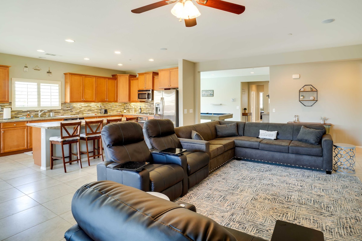 Huge (20'x40') heated/cooled salt-pool/spa with tanning deck/basketball hoop. Putting green/fire pit in huge backyard (0.32 acre) surrounded by unobstructed mountain views. Big patio w/dinning table for 10, 6 burner bbq grill/pingpong/cornhole. Airhockey/Foosball/65" TV w/ YoutubeTV/Netflix/Disney+. A fully-stocked gourmet kitchen, purified water, Nespresso machine. Hotel-style amenities. Close to all stores, restaurants, Tennis and Coachella. No party allowed. LIC-067667