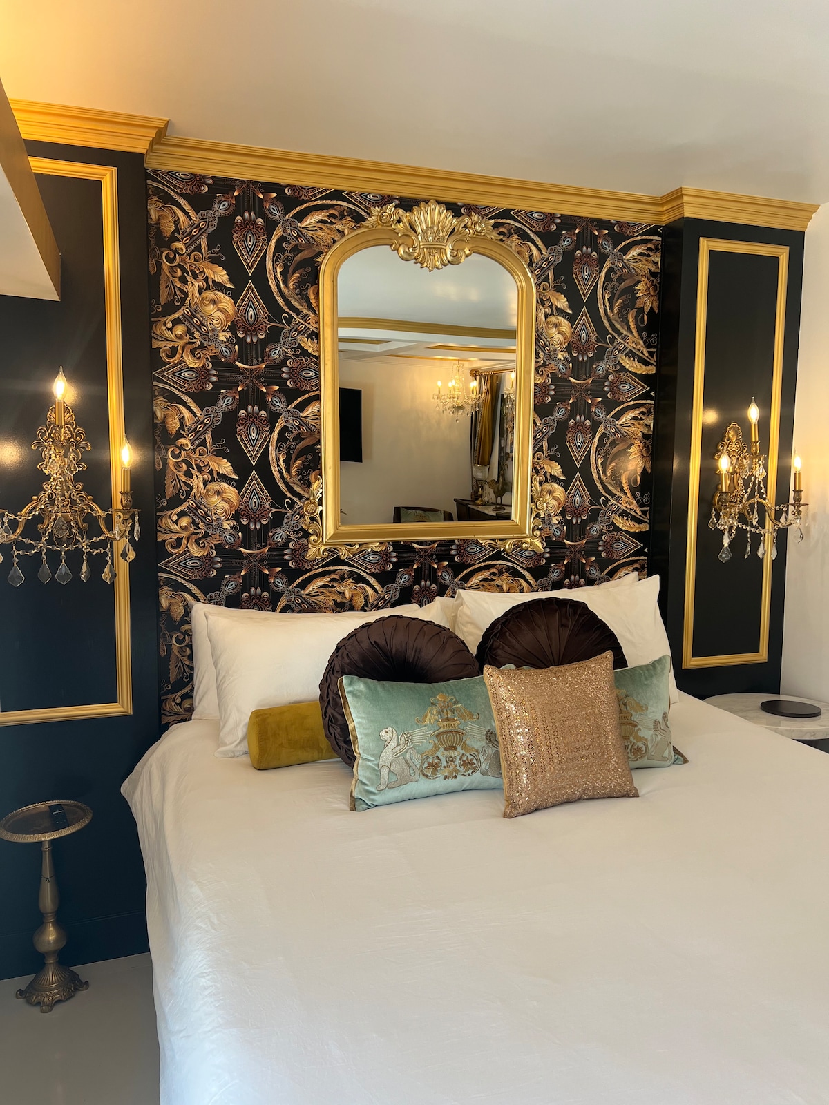 Inspired by the timeless style of the legendary Liberace, this opulent haven dazzles with crystal chandeliers and lavish gold accents, gilded to reflect the radiance of Mr. Showmanship. Indulge in the regal king-sized bed, luxuriate in the spacious bathroom with an oversized vanity and shower, and unwind in the enchanting sitting area glittering with gold accents. In the The Candelabra Suite, every moment is a celebration of grandeur and theatricality.