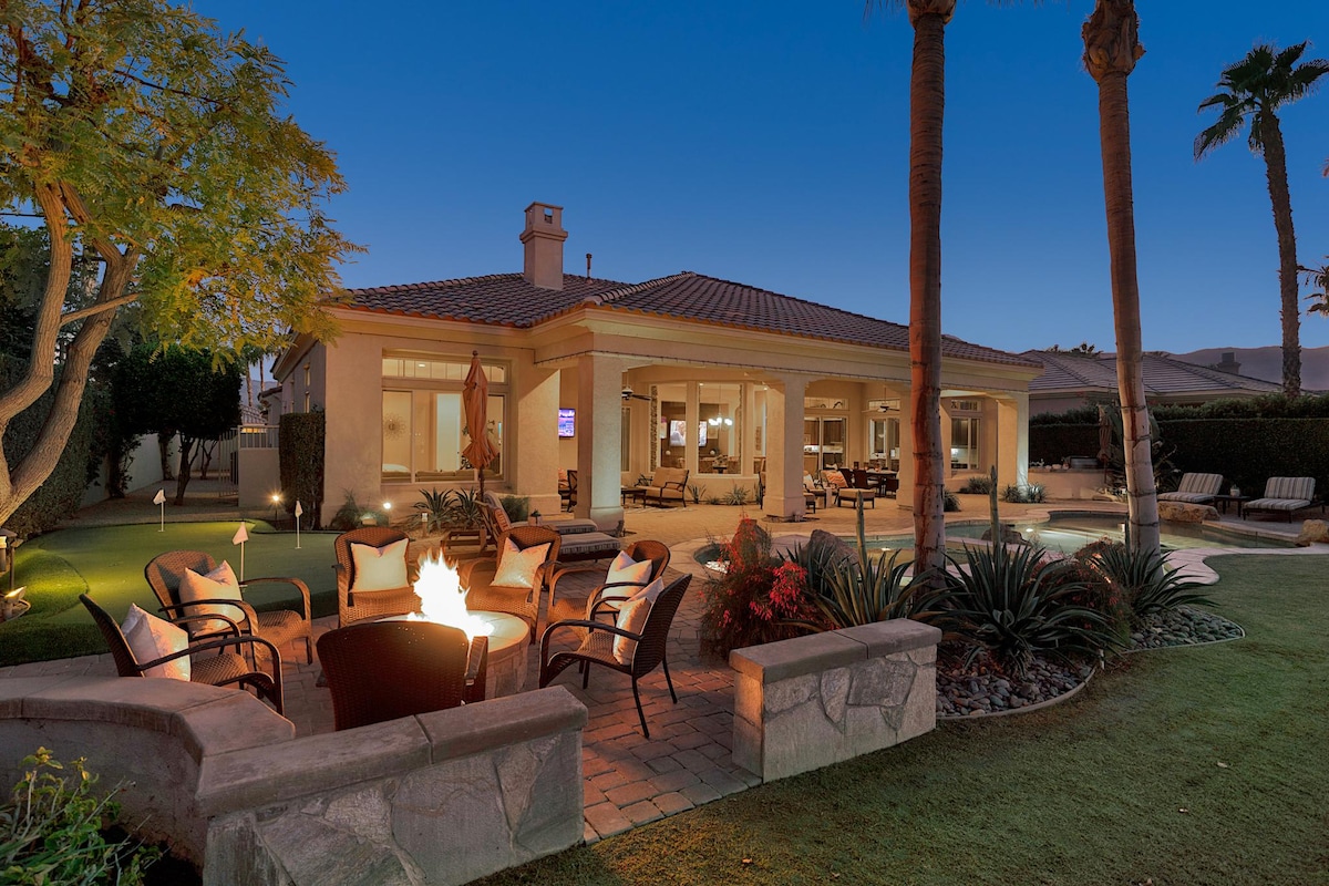 Brand newly decorated and updated 3020 sq. ft. executive home on the PGA West Nicklaus Course. Extra tall 12’ ceilings and beautiful design make this desert vacation home a luxury getaway. The perfect family getaway with a custom designed modern pool and sun shelf for little ones, with child safety alarms on doors to the pool for comfort of mind. Every detail has been considered from Kerurig coffee maker & espresso machine to the fire pit & comfortable gathering spaces for family & friends!