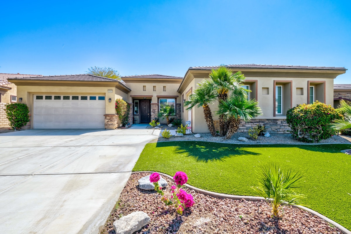 THE perfect house to getaway to the Palm Springs area, situated in Indio! Relax in this beautiful, spacious two-story home featuring a resort-style pool with endless activities! Enjoy the saltwater pool & spa, BBQ, putting green, fire pit & A/C Gameroom. ♥️Guest favorites♥️ *Billiard table *Ping Pong *Foosball *Putting green *Movie projector *Cornhole *Classic arcade games *Baja shelf pool *Poker table/set *Stocked kitchen *Kid-friendly *Creating lasting memories *Beautiful neighborhood