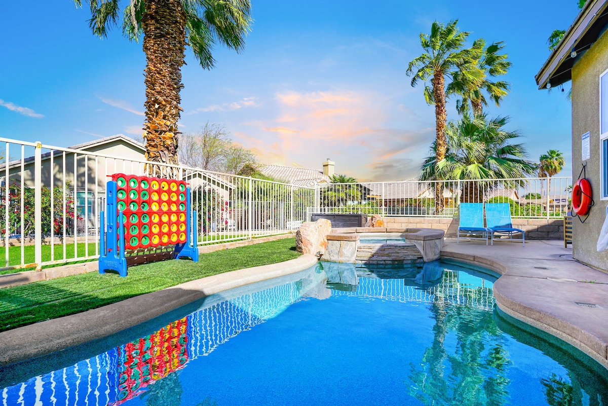 Escape to your private desert oasis—where sunshine, palm trees, and peaceful golf-course views create the perfect Indio getaway. 💦 Saltwater pool & free spa heating 🎮 Game room: pool table, ping pong, arcade & smart TV 🛏️ Sleeps 10: 2 Kings, 1 Queen, Queen+Full bunk 🍳 Chef’s kitchen + coffee bar 🔥 Fire pit, BBQ, outdoor dining & lounge 🎾 Tennis, pickleball & gym (4 guests) 🚗 Near Indian Wells, La Quinta & Joshua Tree