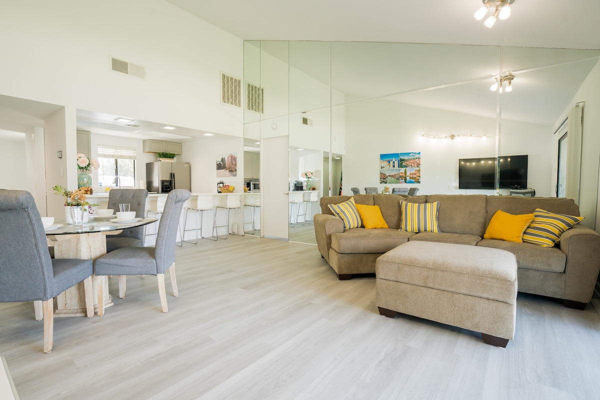 Well-kept and updated townhouse in gated South Palm Springs Community, surrounded by the Tahquitz Creek Golf Course. This home is comfortable, clean, with a hotel feel AND the comforts of home. Front Patio is excellent for your outdoor/social enjoyment which provides a great view of the community, eating/sitting areas, and a fire pit. The rear patio is more private with a BBQ. Come enjoy your stay, swim, play, or go to town. Palm Springs Vacation Rental ID #007086
