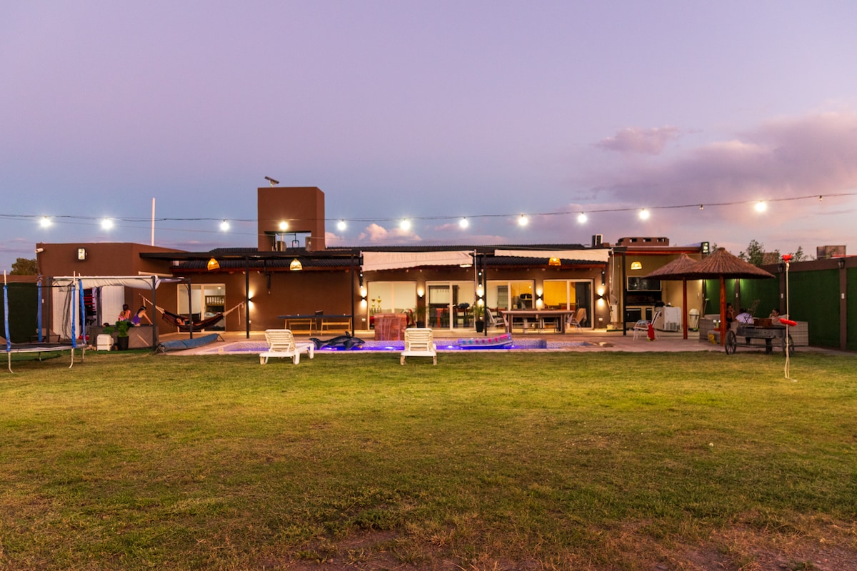 Bienvenidos a esta casona! Tiene un estilo muy particular, una combinación entre rústico y moderno. Fue terminada a fines del 2008, y cuenta con todo lo necesario para que no quieras salir durante tu estadía. Es una casona única por su arquitectura, ubicada en el Dique de Ullum, con increíble vistas al espejo de agua y cordones montañosos. La casona cuenta con todas las comodidades para disfrutar de todas las instalaciones de un hogar y la tranquilidad de su naturaleza durante su estadía.