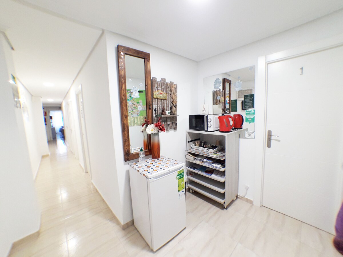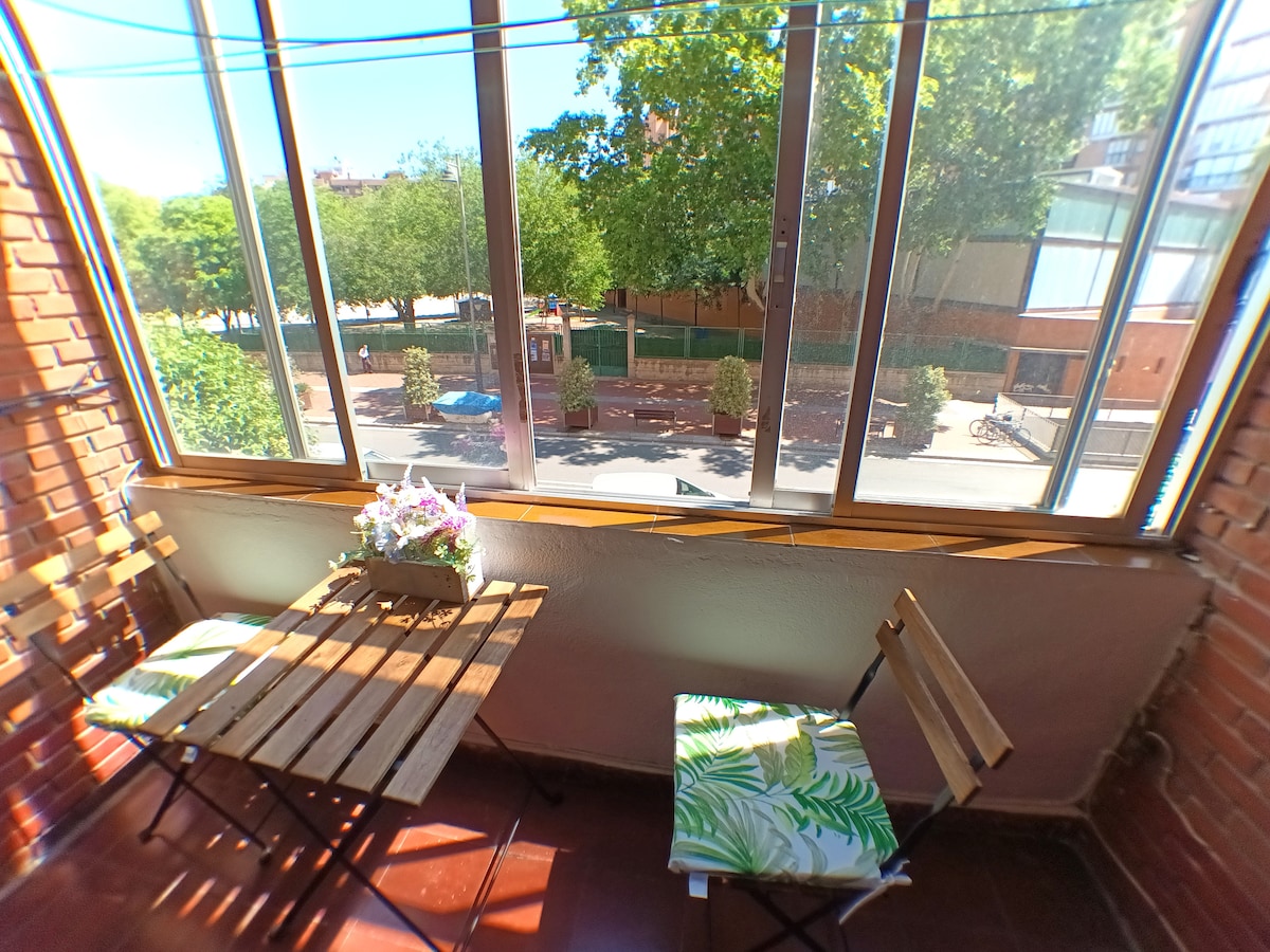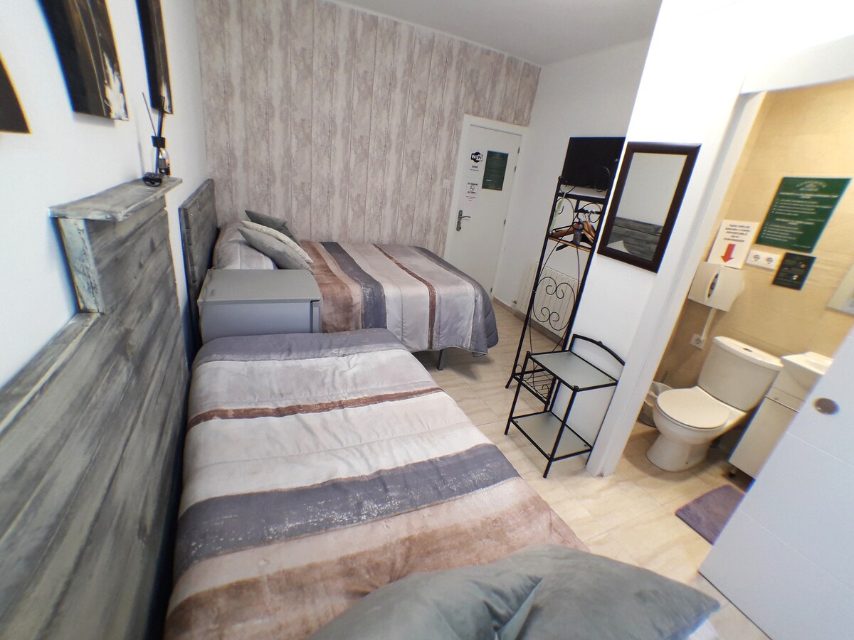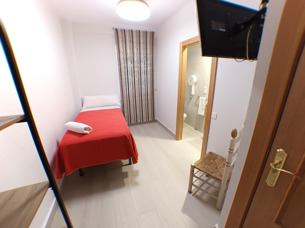 Habitación con una cama de matrimonio, una cama individual y baño privado Amplio dormitorio con una cama de matrimonio y una cama individual Exterior Habitación equipada con: 1 cama de matrimonio 1 cama individual 1 mesilla de noche Espejo Televisión WiFi Perchero Nevera Ventilador de techo Balcón con zona de descanso y vistas a zona residencial Suelo de baldosa Ropa de cama y toallas Baño privado con ducha dentro de la propia habitación