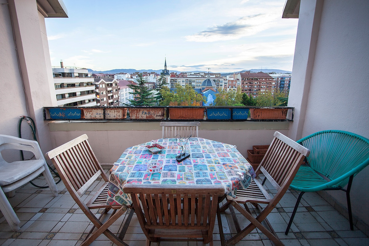 Luminoso ático en el centro de Logroño con plaza de parking gratuito en el edificio contiguo, 3 habitaciones, 1 baño completo, salón-comedor y cocina equipada con una hermosa terraza con vistas a Logroño en la que poder desayunar, comer o cenar. El piso es tranquilo, no te molestaran los ruidos de la calle pero tendrás todos los servicios, supermercados, bancos, gimnasio... a menos de 1 minuto andando, a 5 minutos de la Cl. Laurel (Senda de los Elefantes), a 6 minutos de la Cl. San Juan, ...