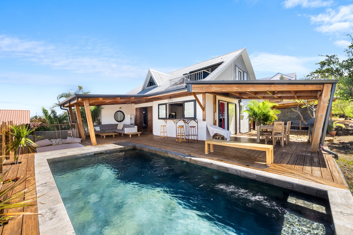 Bienvenue à la Villa Louane (100m2), perchée sur les hauteurs de Saint-Pierre, 135m d'altitude, idéale pour un séjour détente avec une vue à couper le souffle sur la mer et la ville de Saint-Pierre. Cette location allie tranquillité et panorama exceptionnel. ● Capacité jusqu'à 5 personnes ● Piscine à débordement, parfaite pour se rafraîchir en admirant le coucher du soleil. Une douche extérieure ● Une terrasse en caillebotis, 50m2 environ, avec un kiosque pour prendre un apéro et admirer la vue