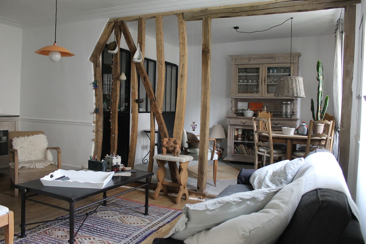 Appartement de charme, centre ville de Vernon, 2mn à pied de la gare, 10mn de Giverny, très calme (sur cour intérieure) et très lumineux (plein sud). Appt au 1er étage sans ascenseur : séjour avec canapé convertible en lit double, cuisine attenante entièrement équipée (plaque vitrocéramique, machine à café Nespresso, bouilloire, grille pain, micro ondes combiné/four traditionnel), chambre avec lit double (160x200cm), salle de bain avec baignoire, wc séparés. Garage fermé à 3mn à pied.