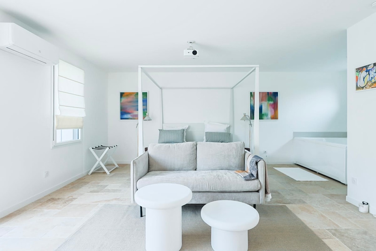 Villas Véronique, un bout de paradis sur l’Ile de Ré. Un endroit unique pour une nouvelle approche du luxe. Superbe villa avec piscine chauffée privative avec mer à 100 m. La pièce à vivre est ouverte sur l'extérieur. Une chambre avec un lit double et une literie de grande qualité communique avec le salon par l'intermédiaire d'une grande porte sculptée en bois de palissandre. La deuxième chambre possède un lit simple. La salle de bain dispose d'une douche à l'italienne en pierre naturelle.