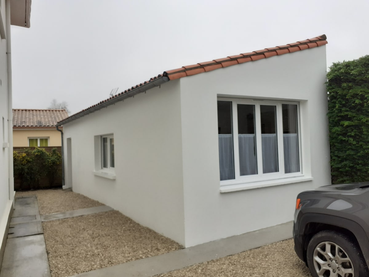Charmant studio neuf et lumineux donnant sur un petit extérieur accompagné d'un terrain de pétanque vue sur un nid de cigogne. Mezzanine mansardé, accès avec escalier amovible, lit deux places avec filet et garde-corps . Kitchenette équipée (cafetière filtre, frigo, plaque induction), petite salle de bain (douche), coin salon télé avec canapé lit 2 places et accès wifi. Petit village calme et situé à 15 min des plages en voiture