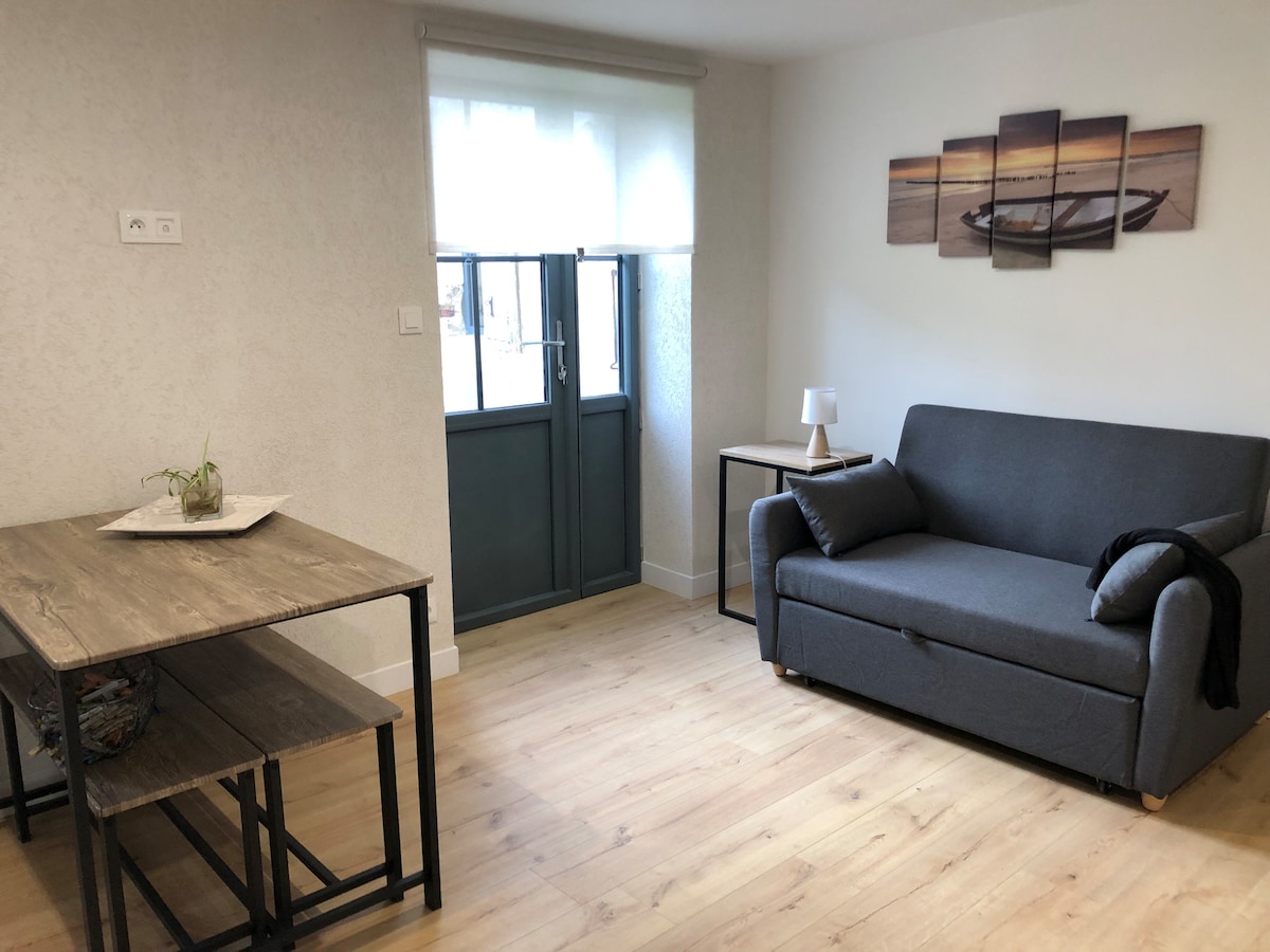Studio indépendant situé dans un endroit calme avec vue sur un bois Natura 2000. Vous aurez accès à un petit jardin privatif qui vous permettra de profiter des belles soirées d’été où vous pourrez réaliser des grillades grâce au barbecue mis à disposition. Le studio dispose d’un lit de 140cm ainsi qu’un BZ de 140cm (+ 1 lit bébé), l’accent a été mis sur une literie confortable et de qualité. Draps et serviettes de toilette fournis.