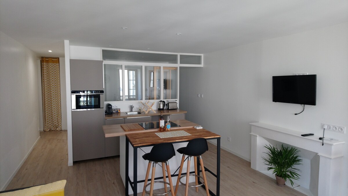 Very nice apartment completely renovated like a loft in a house of character. Large living room bathed in light thanks to its numerous openings allowing to take advantage of the sun rays, including a fully equipped kitchen, a dining area, a living room and a mezzanine accommodating a bed 160. A large bedroom with cupboards and shower room. A few minutes walk from downtown and on the direct axis to the island of Re. Settle down, you are at home!