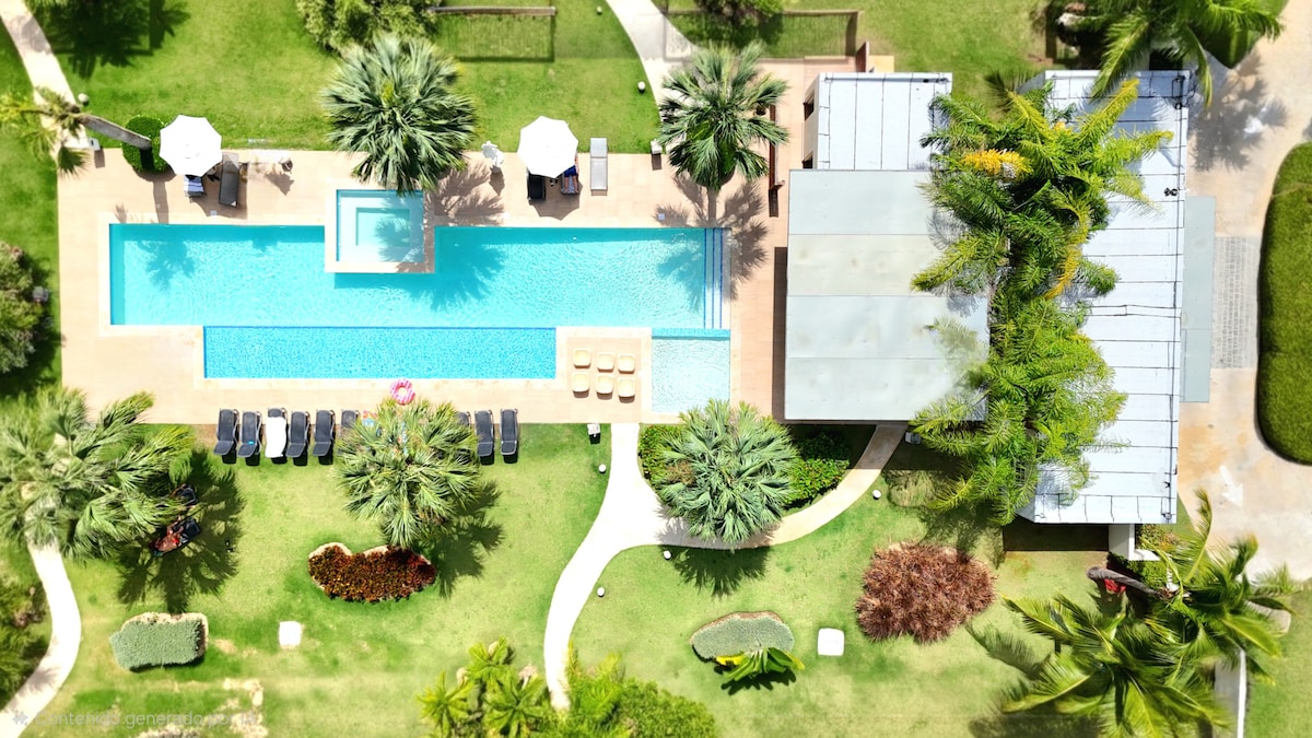 Relax at this beautiful peaceful place with a private pool and surrounded by privates gardens. Tracadero is a beautiful beach club in front of the sea, with many pools, restaurant, pool bar, spa, and it's just in front of the house, as my guests you have free entrance during stay. the beach is 700 meters away (sargassum-free). Near are many restaurants, pizzerias, ice cream shops, groceries stores, excursions, etc. Punta Cana Airport is 55 minutes away, La Romana Airpor 17 minutes away.