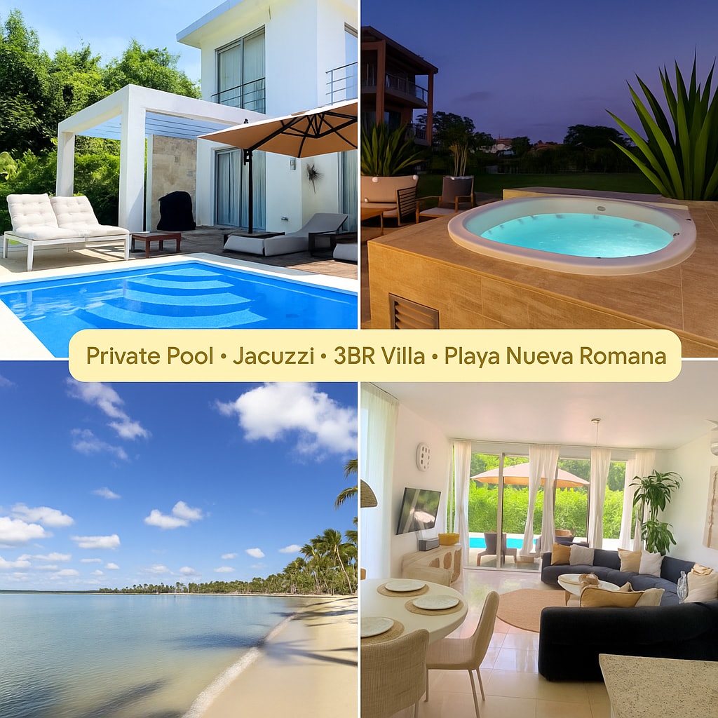 ✨ Discover luxury at our villa in Playa Nueva Romana. Just 45 min from Las Américas Airport, 20 min from La Romana, and 60 min from Punta Cana ✈️. This two-story residence features exclusive finishes and personalized décor 🏡. Perfect for relaxing, spending time with family, and creating unforgettable memories 💕🌴. Enjoy a private pool 🏊, outdoor jacuzzi 🛁, private beach access 🏖️, lush green areas 🌿, and on-site restaurants 🍽️. Your Caribbean oasis awaits! 🌞