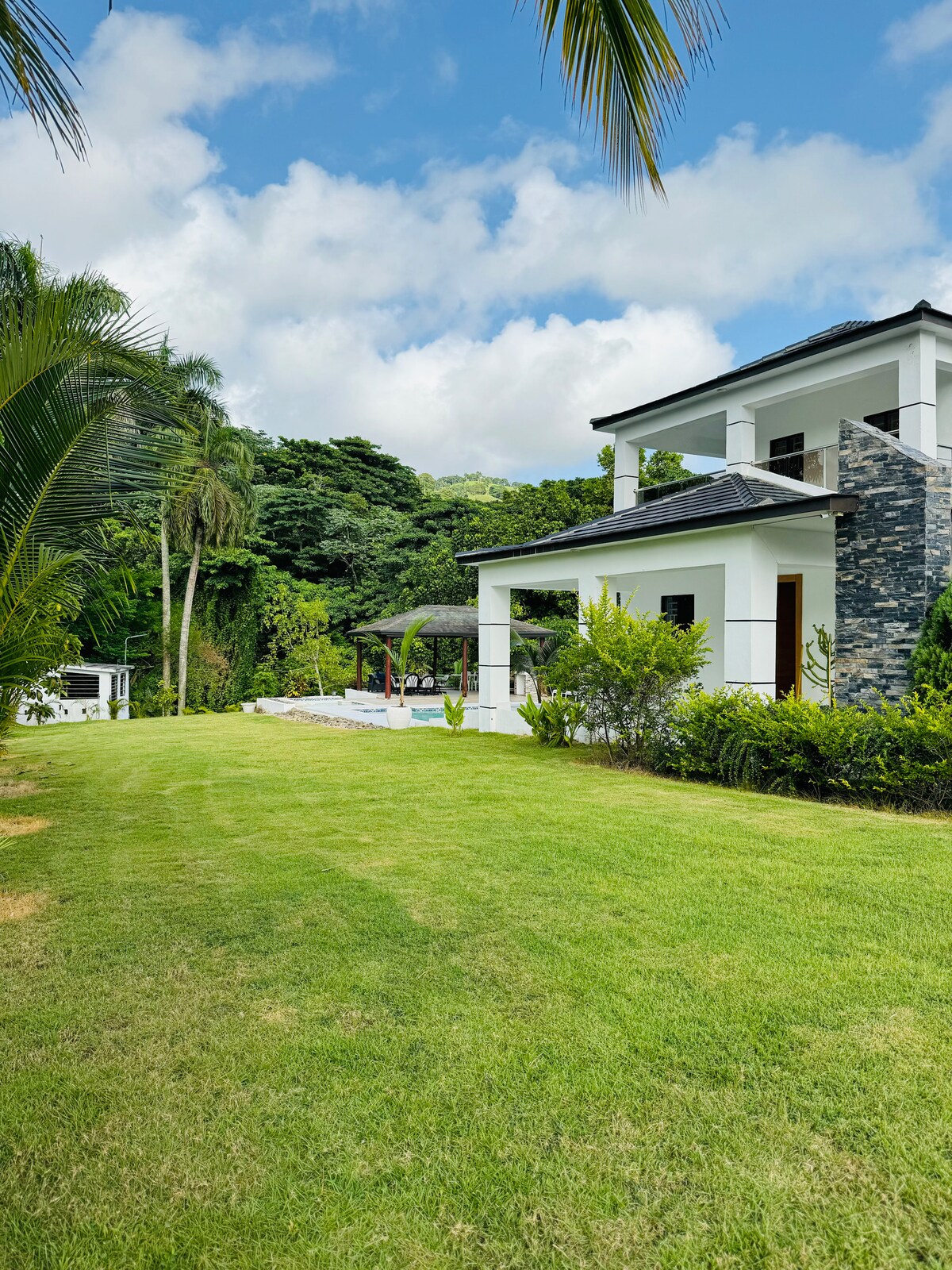 Exquisite luxurious villa. Minutes from Minitas Beach. Everything is new, sophisticated & superior quality. The Villa is one floor, enormous living room to entertain, dine, rest & relax on the rocking chairs or garden bed overlooking the renown Links Golf Course. Enjoy dinner Al Fresco in the outdoor dining table on the deck with trees and string lights. It also has a beautiful Studio, Pool and BBQ. Fully equipped kitchen and laundry. Chambermaid and Cook included. Golf Cart 4p