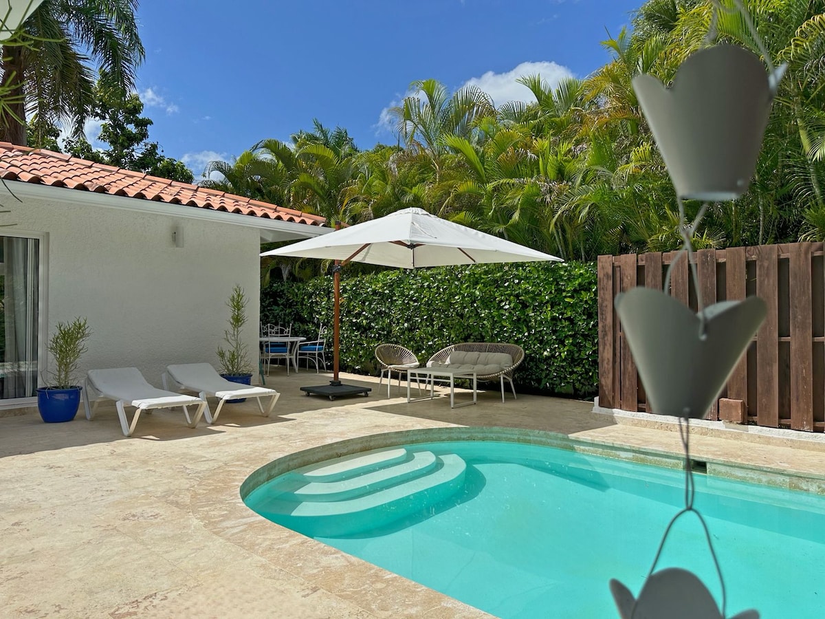 Vivero 7 is modern oasis featuring 4 bedrooms, two with 2 full beds, one with a queen and the master with a king bed. Each room equiped with a new AC and a flat screen tv, wifi, closet and their own bathroom. The villa has a AC in the living room and dining area, and an open concept living room. The expansive terrace with a beautiful climatized pool and lush garden so guests can enjoy. A 3 minute drive to minitas beach, 7 minute to the marina and chavon. Full time staff (maid/cook) included.