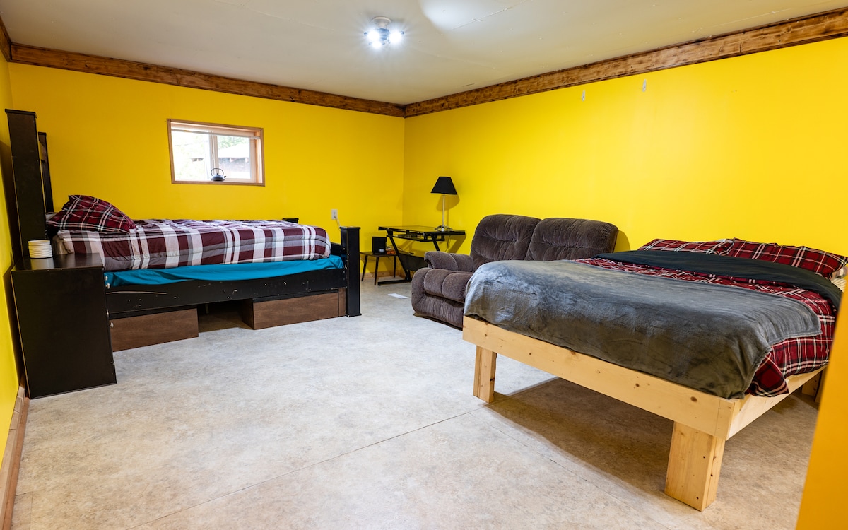 The Birch Bunkhouse is a comfortable space that sleeps up to four people, with one queen bed and one double bed. The open-concept living room and kitchen make it easy to cook meals and relax after a day of work or recreation in the North. The unit also includes a spacious three-piece bathroom and laundry facilities for convenience during longer stays. Outside, guests can use the yard and enjoy an evening campfire.