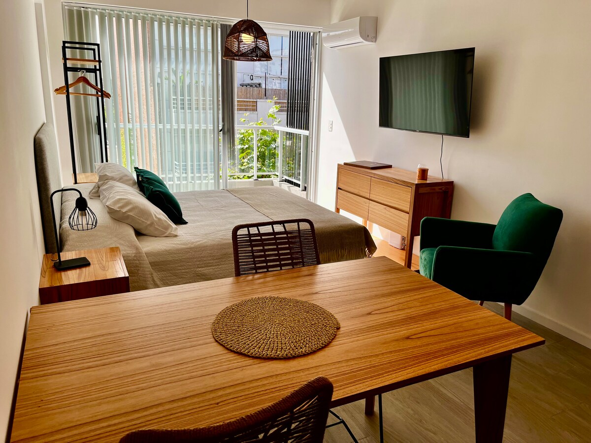 --Please read the rules before booking.-- Children under 12 years of age are not allowed because there is no safety net. This spacious studio has everything you need to make your stay a pleasant one. It has a super king bed (2 x 2 m), bathroom, closet, big table, refrigerator, microwave, nespresso, toaster, stove burners and all kitchen utensils. The building has 24 hour security, gym, laundry, rest or work area and pool.