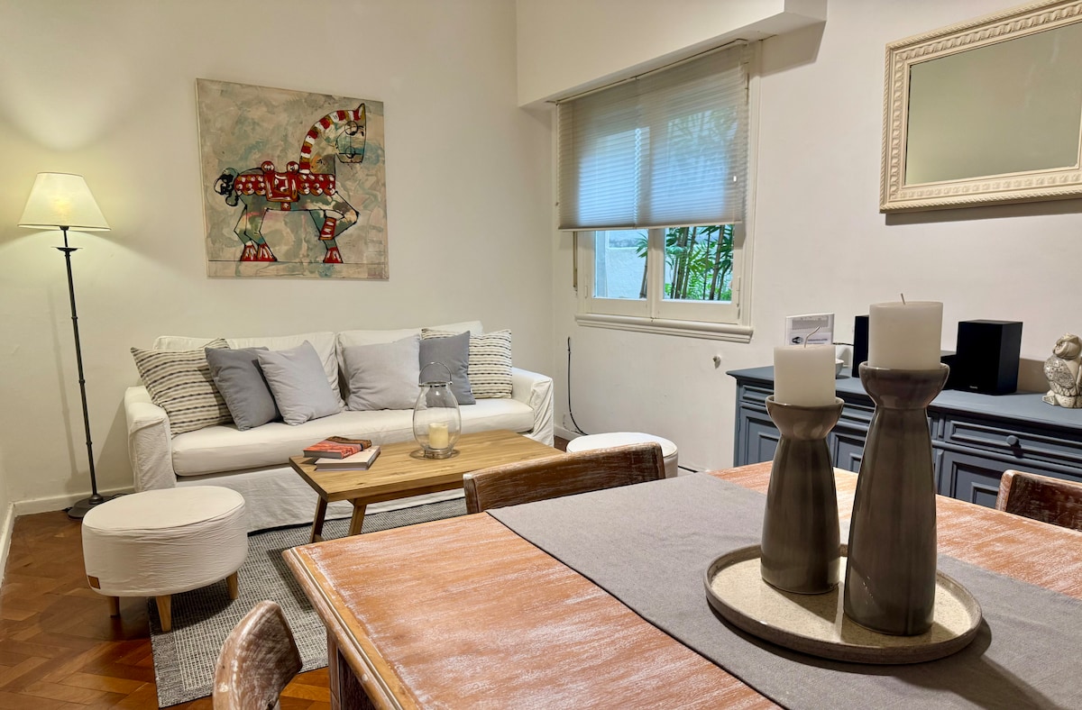 Departamento con vista al Jardín Botánico, ubicado en una zona privilegiada de Palermo sobre la avenida Las Heras, cerca de todo. Su ambientación de estilo contemporáneo y su equipamiento completo están pensados para que te relajes y disfrutes de tu estancia, ya sea que nos visites por trabajo o por vacaciones El mismo incluye, entre otros aspectos, aire aconodicionado y Smart TV en living y dormitorio, electrodomésticos y untensillos de cocina, lavarropas e internet por fibra 200M.
