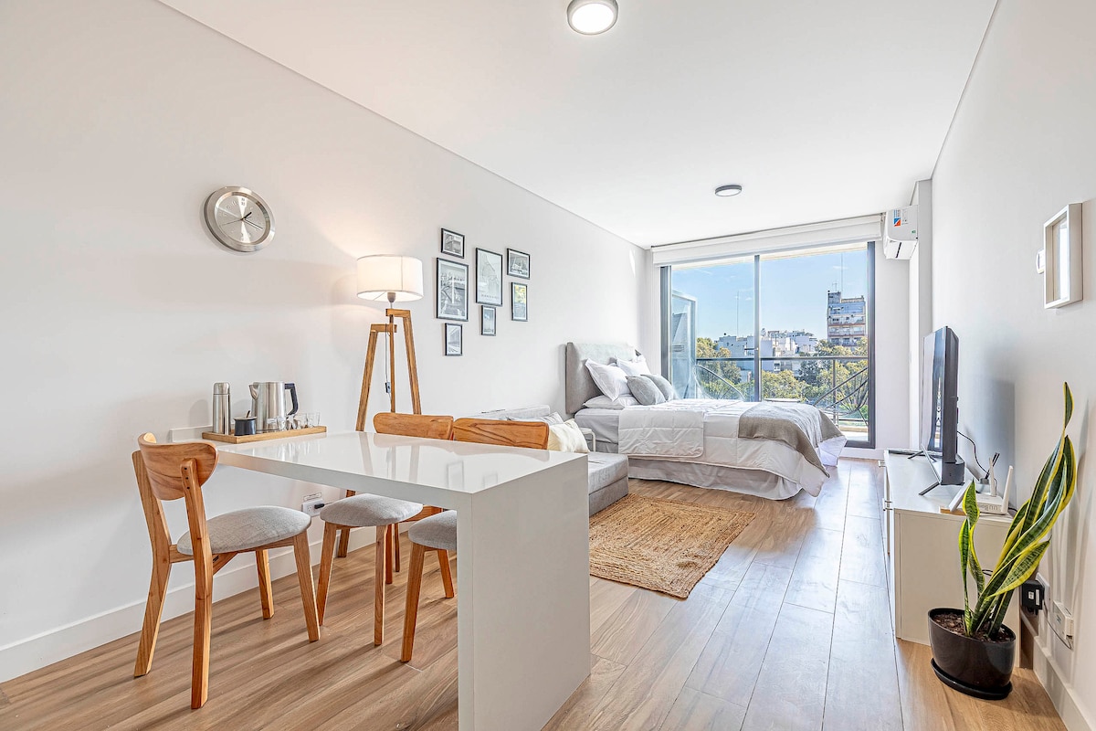 Este luminoso estudio ofrece todo lo necesario para que disfrutes tu estadía en Bs As. Práctico para viajes de placer, trabajo o trámites. Capacidad: hasta 2 huéspedes. Cercano a La Rural, Embajada de EEUU, Aeroparque y espacios verdes de la ciudad (Ecoparque, Jardín Botánico, Rosedal). Próximo a shoppings y restaurantes, bares y cafés típicos. Ubicación estratégica, a metros del subte D, tren y Metrobus -con gran cantidad de colectivos-, permite llegar rápido al centro de Buenos Aires.