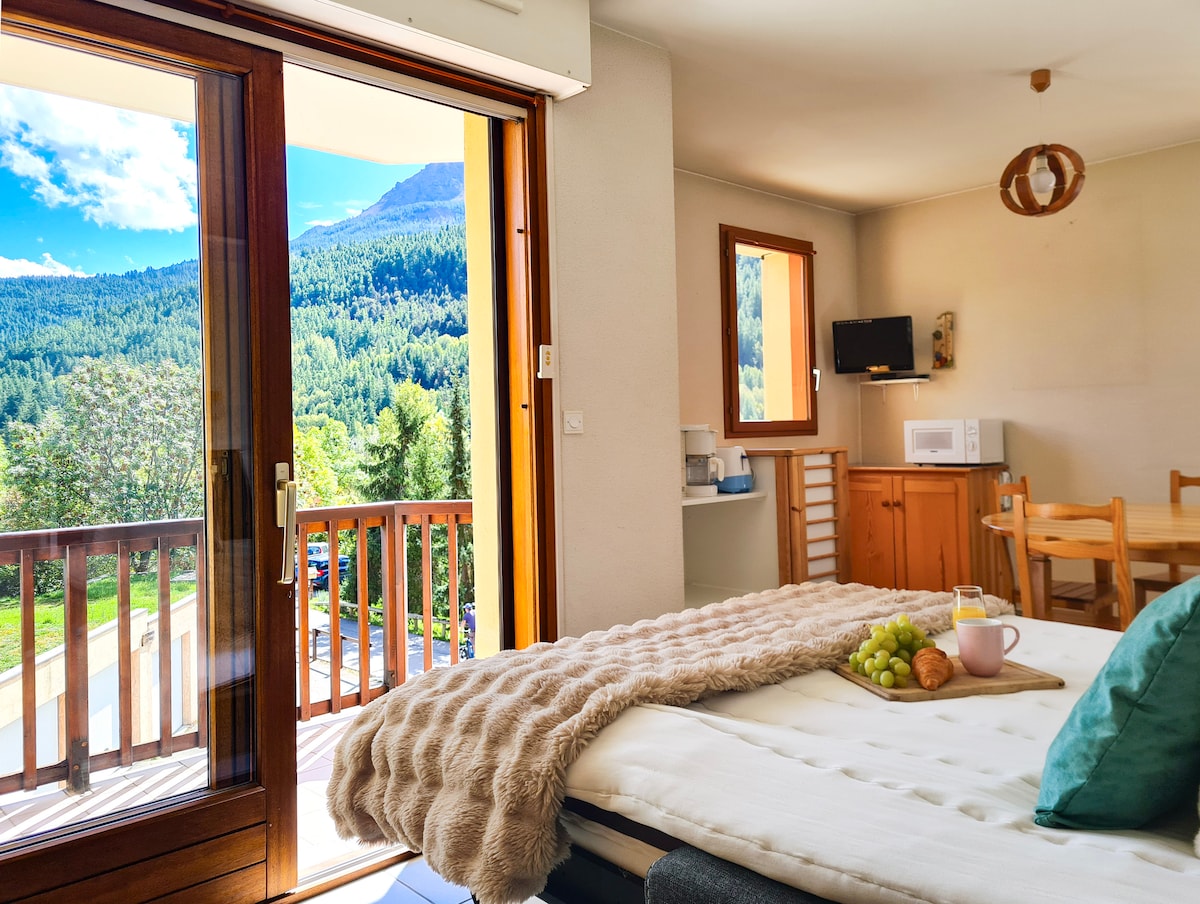 A cozy cocoon in the heart of Serre Chevalier Vallée: Your haven of peace awaits you. 1 room of 30 m² Once your vehicle is parked in its private space, everything is within walking distance: Close to all amenities (shops, restaurants, pharmacy, rental companies, tourist office, ESF (French Ski School), ice rink, swimming pool) Winter: New Pontillas ski lifts 300 meters away Summer: Pontillas lake 250 meters away, municipal swimming pool 100 meters away Dishwasher, washing machine, terrace