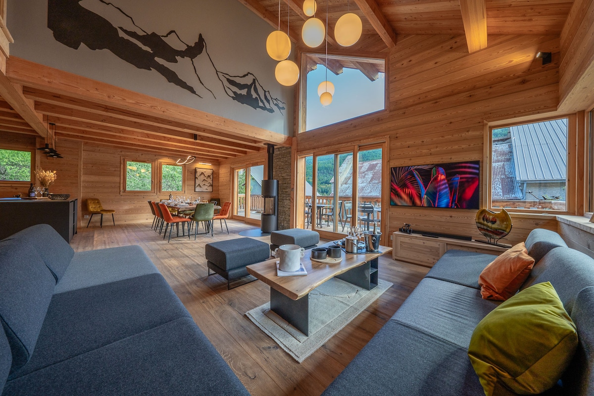 Luxueux chalet au cœur de briançon, avec piscine en été chauffée et une terrasse électrique couvrante , jacuzzi , sauna. Chalet idéal pour une famille avec 4 chambres, grand séjour et grande terrasse, filet détente et pool house avec un grand ilot (plancha, friteuse, evier) salon et wc.. A 800 m des pistes de briançon vous bénéficierez d'un ensoleillement plein sud pour skier. Internet gratuit avec fibre. Espace enfant avec mur d escalade, petit salon, jeux divers et table de ping pong.
