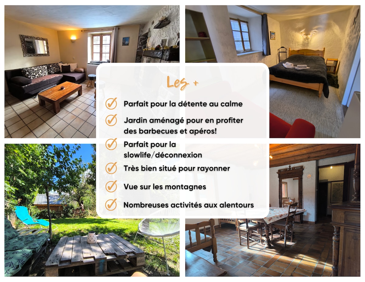 Une maison de village chaleureuse, comme un chalet tout en hauteur (sur 3 niveaux, la pièce de vie située en haut). Parfaite en hiver comme en été pour ceux qui veulent profiter de la vallée. Nous déconseillons aux familles avec jeunes enfants ne maîtrisant pas les escaliers, un peu raides. La maison est dans un très beau village de montagne, avec un parking à 250m. Vue magnifique sur les sommets, un balcon mais pas de terrasse.
