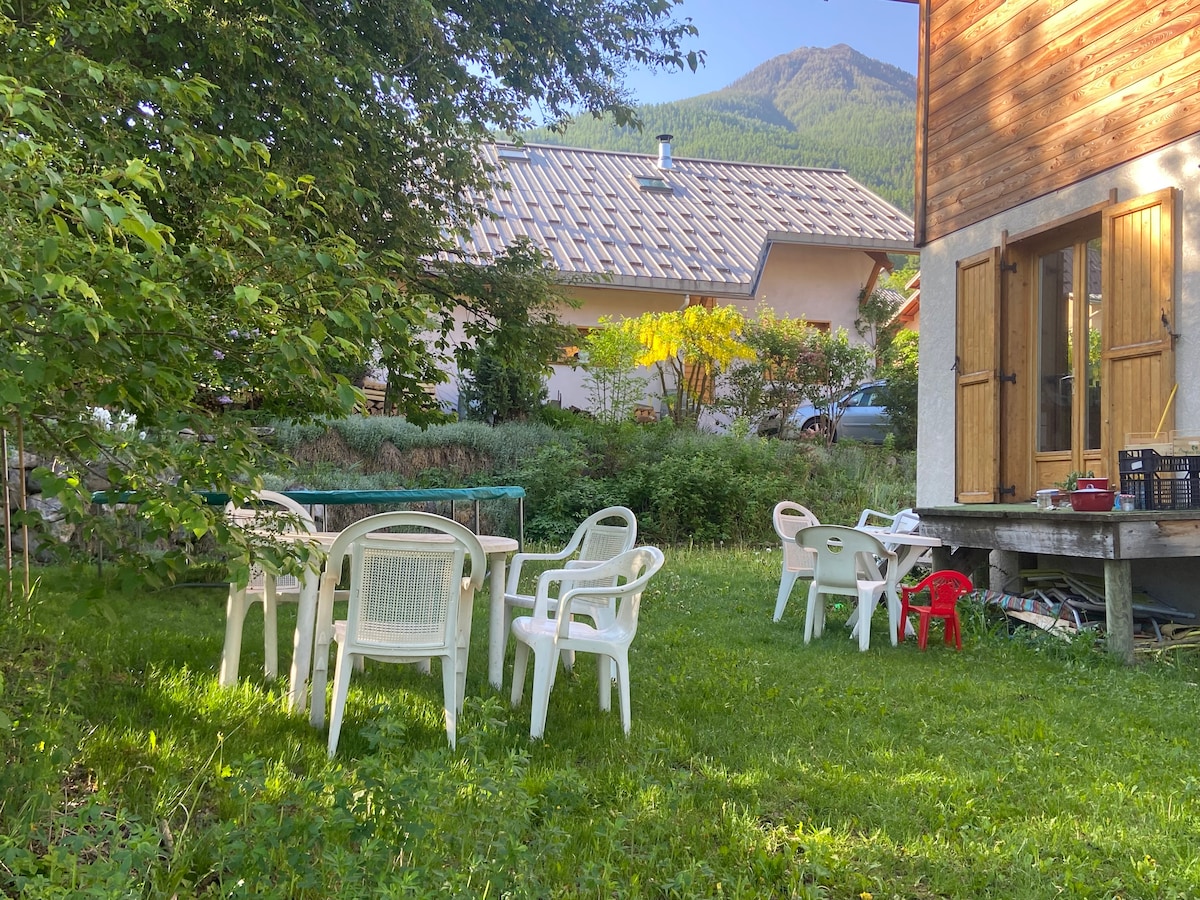 Une belle maison familiale pratique, avec grand jardin, balançoire, trampoline, potager, parking privatif, belle exposition sud à 5 min du centre ville de Briançon et d'un arrêt de bus et au milieu d'une multitude de sentiers de trail, randonnées et VTT, calme garantie 1er étage 1chambre avec lit double accès balcon 1 chambre avec 2 lits enfants: fille et garçon accès balcon 1 salle de bain avec baignoire et douche italienne RDC 1 cuisine tout équipée 1 salon 1 salle à manger 1 wc 1 cellier