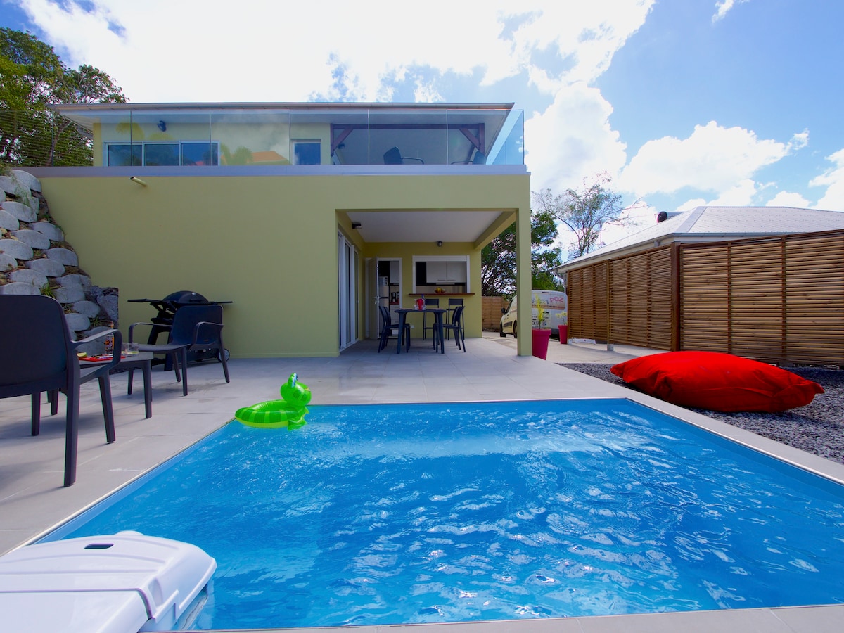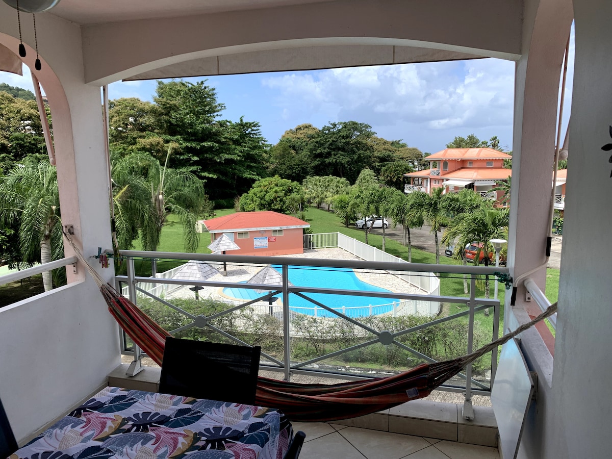 Quiet, romantic 2-room apartment 105 m2, intimate with its private "pool house" space, just for you whith: spa, swimming pool, barbecue, plancha, Ping Pong and relaxation area. All in a green setting with a panoramic view of the Caribbean Sea, Mount Pelée and the bay of Fort de France. Restaurants and shops are 2 minutes by car from Bourg des Trois-Ilets and the most beautiful beaches are 10 minutes away.: The best geographical location for visiting the island. Closed parking. Fiber internet