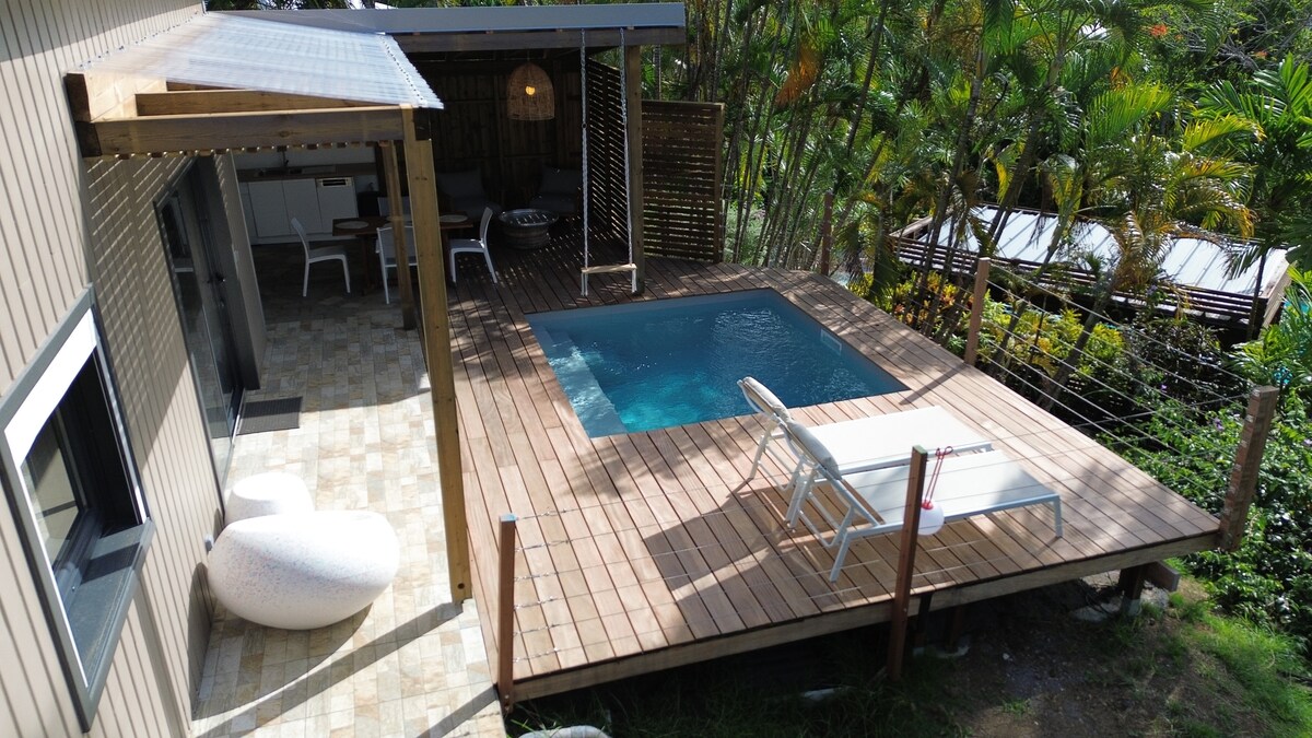 Turtle Bay Locations Grande Anse - Martinique Mini Villa T1 en hauteur offrant une vue panoramique sur la mer et la campagne. Accès mer à 50m à pieds. Plage connue pour ses nombreuses tortues vertes visibles en palme masque tubas toute l’année. Composée d’une chambre climatisée avec moustiquaire, une salle de douche avec WC, une cuisine équipée sur la terrasse couverte et une piscine privée de 2m*3m sur la terrasse découverte. Restaurant TiSable à 50m et petits commerces à 500m.