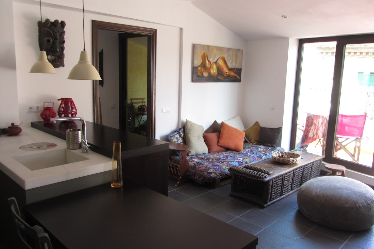 75m2 loft apartment with modern and unique architecture. Carefully designed, decorated with vintage-style furniture and art carefully selected over the years. This combination, along with a spectacular and impressive view over the bay of Cadaqués, makes it absolutely unique. It is located just 1 minute walk from Es Poal beach, about 45m away. PET friendly. We love animals. Please inquire privately about the extra cost per night for your adorable and furry friend.