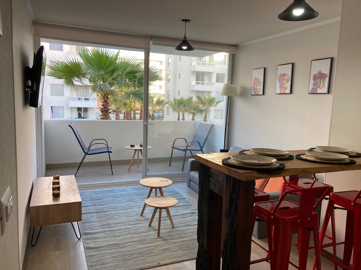 Escapate frente al mar con tu familia. En cualquier época del año, sientete como si estuvieras en tu hogar. Atardeceres desde la terraza, donde se ve toda la bahía de coquimbo y la serena. En las noches cielos despejados y estrellados, respirando el aire marino. Todo esto frente del mar, piso 19, para 5 personas. A un costado del casino Enjoy. piscina al aire libre y vista al infinito. Kinchos Con vista panoramica. Estacionamiento gratis. Saliendo del condominio avenida costanera