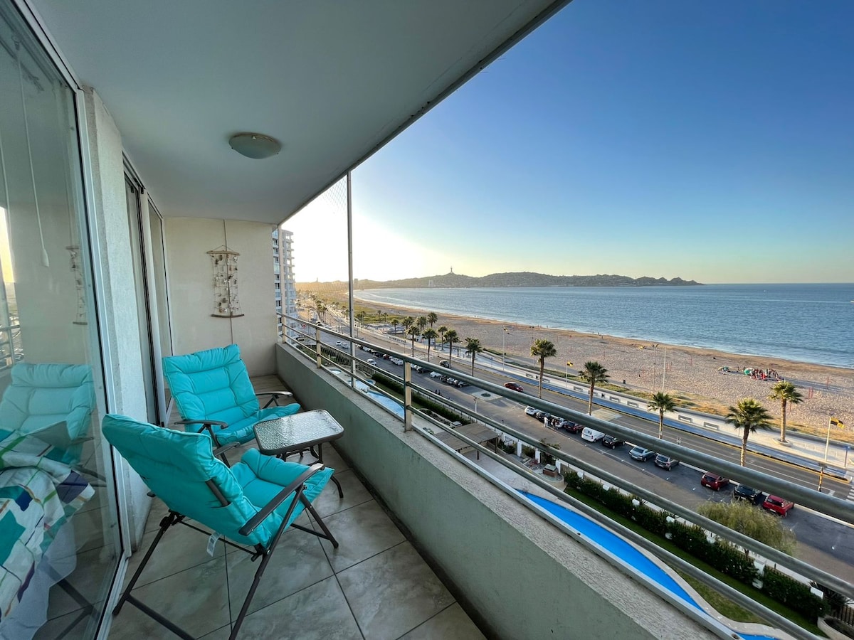 Hermoso departamento frontal primera línea, de la terraza una vista a toda la Avenida del Mar y la playa. Piso 7, Estacionamiento, 2d 2b y 1 futón. Piso flotante nuevo, cocina americana, TV, Wi Fi, Juegos de Mesa para jugar en familia y una linda hamaca en terraza. Equipamiento Edificio: Gimnasio, cancha de tenis, sala de pool, piscina, sauna, quincho, conserje 24/7, juegos para niño, áreas verdes, sala de eventos. Las camas cuentan con sábanas y cobertor. se dejan 2 toallas