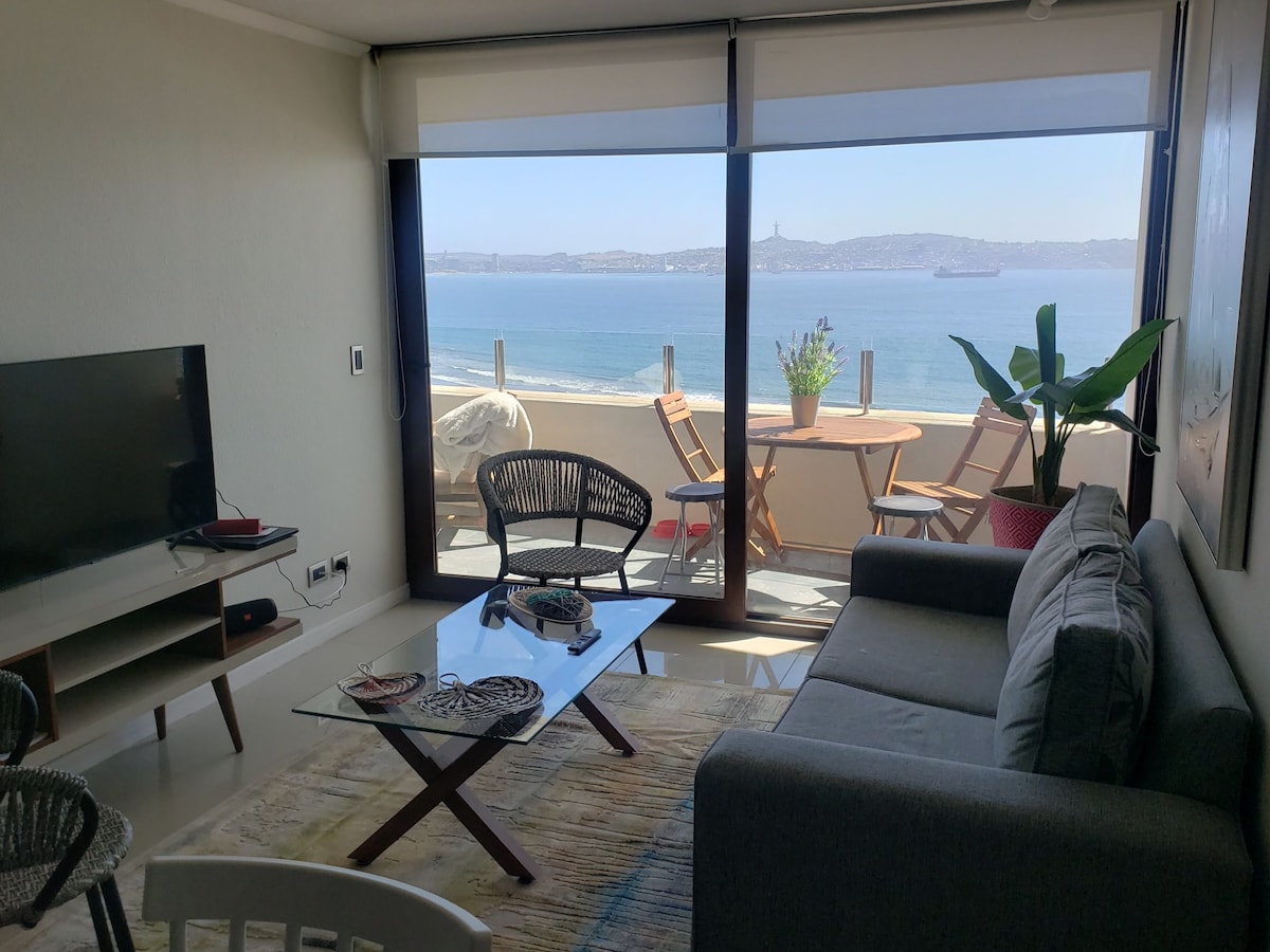 Departamento de lujo en edificio Jardín del Mar. En primera línea, frente al mar, a un costado de Casino Enjoy. Departamento en piso 4, amplia terraza con vista al mar y piscina principal. Completamente equipado. Grandes piscinas al aire libre, piscinas temperadas. Incluye sabanas y toallas. Jacuzzi, Gimnasio, Sauna, Piscina Temperada, llevar gorra de baño. Estacionamiento privado. Incluye SmartTv, Tv Cable (Incluye Futbol Nacional) en Dormitorio Principal y Living e Internet para Teletrabajo.
