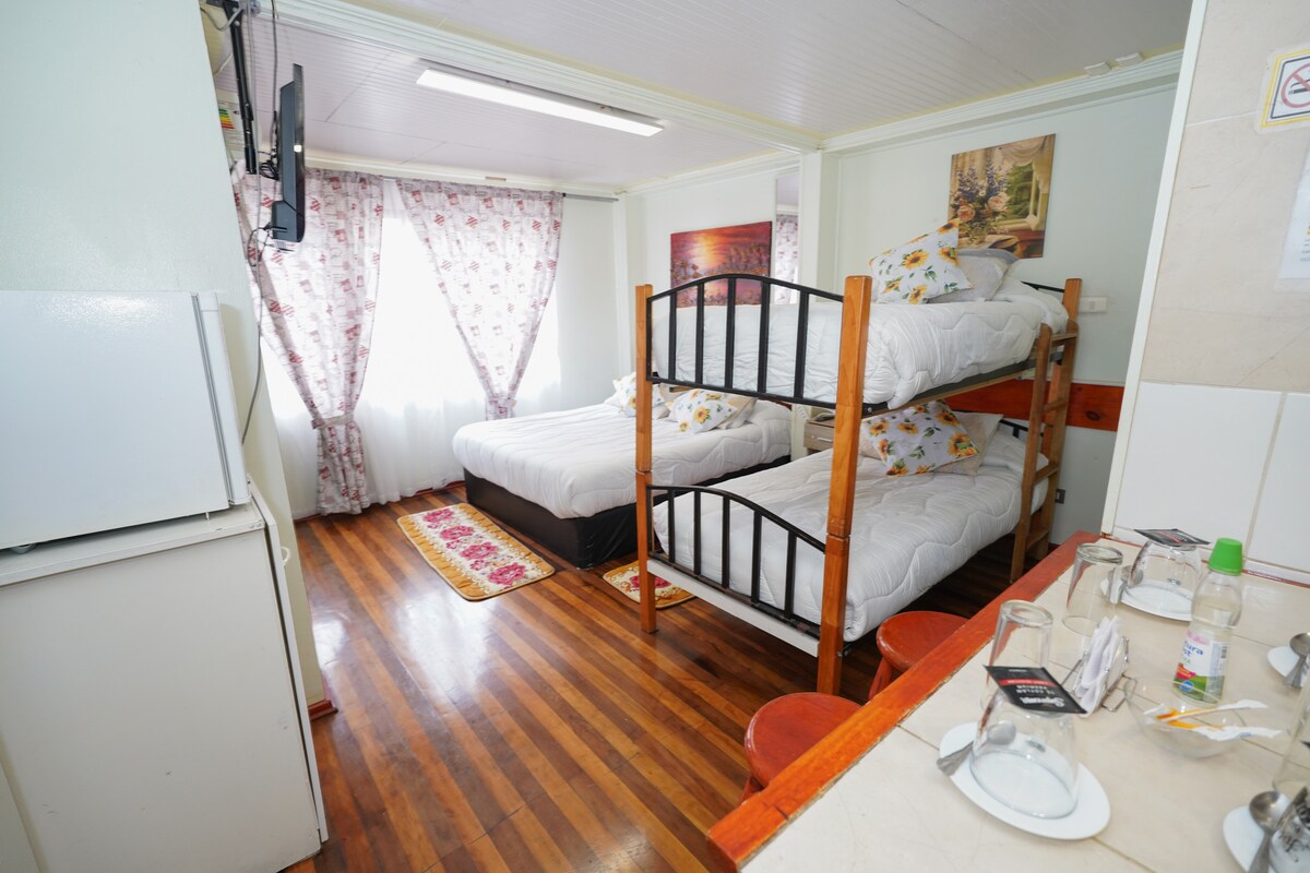 Disfruta de la comodidad y privacidad de nuestra habitación familiar, diseñada para brindar una estancia placentera para toda la familia. Esta habitación cuenta con un baño privado para mayor comodidad y con cocina, ideal para preparar tus propias comidas durante la estadía. La habitación incluye: - Cama matrimonial - Camarote - Cocina independiente, completamente equipada con lo esencial para que puedas cocinar con facilidad - TV/ cable e Internet - Climatización para todas las épocas del año