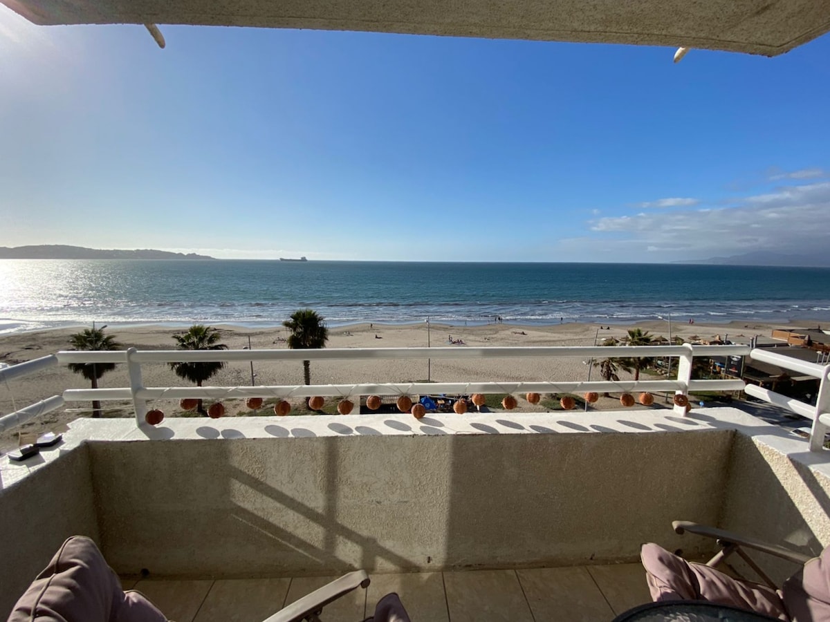 Departamento a pasos de la playa, con espectacular vista de la avenida del mar, VISTA LIBRE ,es un sistema de paneles que cierran la terraza y lo trasforma en un ambiente adicional y seguro. Cercano a diferentes restaurantes y casino enjoy. Un lugar perfecto y totalmente tranquilo para disfrutar con la familia en vacaciones, acogedor y cálido. Totalmente equipado con todo lo necesario, cuenta con Wifi, tv cable, sabanas y toallas, piscina, cocina con todos los implementos, calefacción.