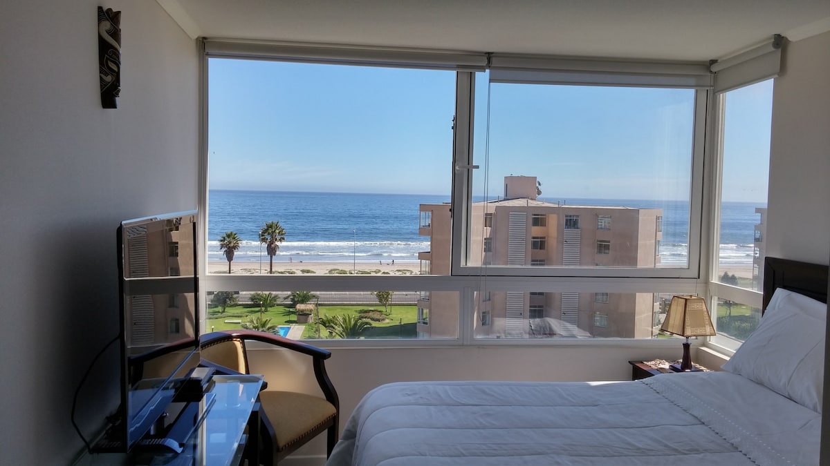 Excelente y amplio Departamento muy cómodo para 8 personas frente al mar con costanera en el mejor sector de La Serena, con 1 estacionamiento , wifi, tv cable, smart tv, 3 lcd 43, lavadora , secadora , cercano a restaurantes, pub, ferias de souvenir . 3 dormitorio, se entrega sábanas, toallas . dormitorio 1: cama King en suite dormitorio 2: cama de 1,5 plaza y 1 cama de 1,5 plaza más 1 plaza ( cama nido) dormitorio 3 : cama de 1,5 plaza y 1 camarote