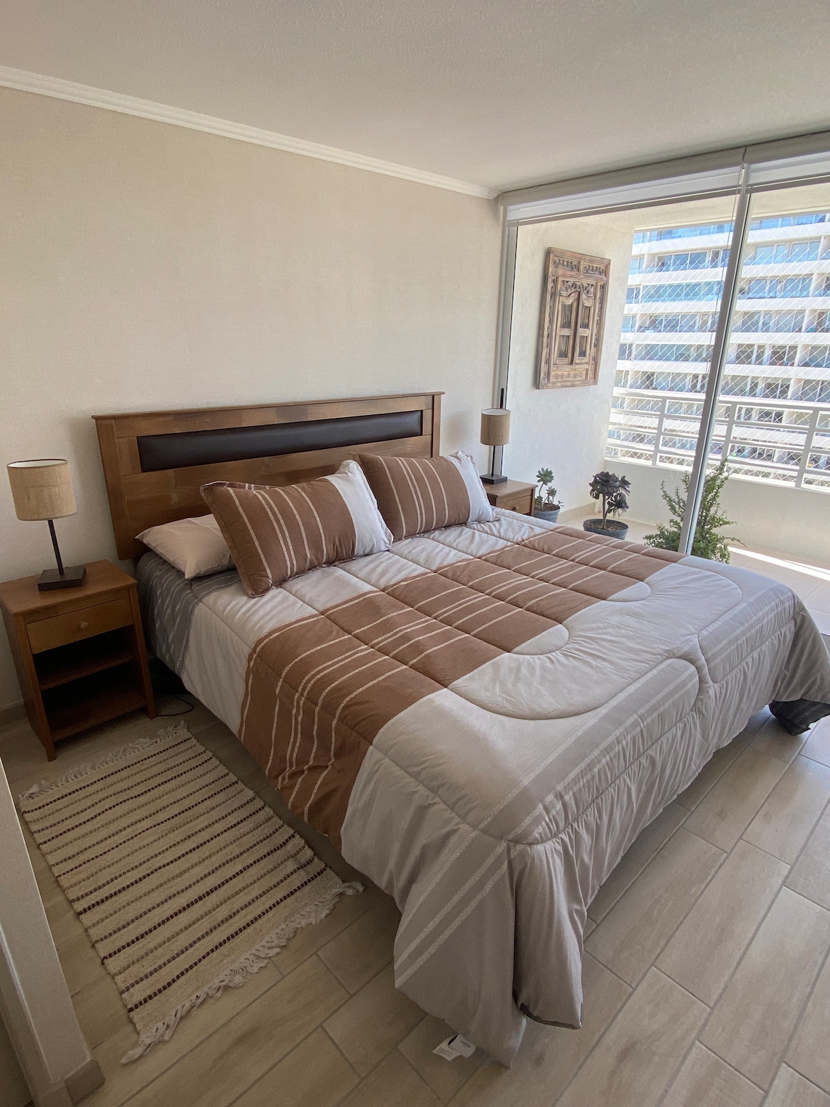 Hermoso departamento, con espectacular vista y ubicado en condominio Gran Marina a pasos de la playa y casino Enjoy. - Habilitado para 5 personas. - Completamente amoblado. - 2 dormitorios. - 2 baños. - Terraza - Tv por cable en dormitorio principal y living. - Internet. - Estacionamiento. - Condominio cuenta con acceso controlado. - Piscina - Quinchos - Amplias áreas verdes y juegos para niños. - Lavandería. - A pasos de la playa. - Junto al casino Enjoy Nota: Toallas no incluidas.