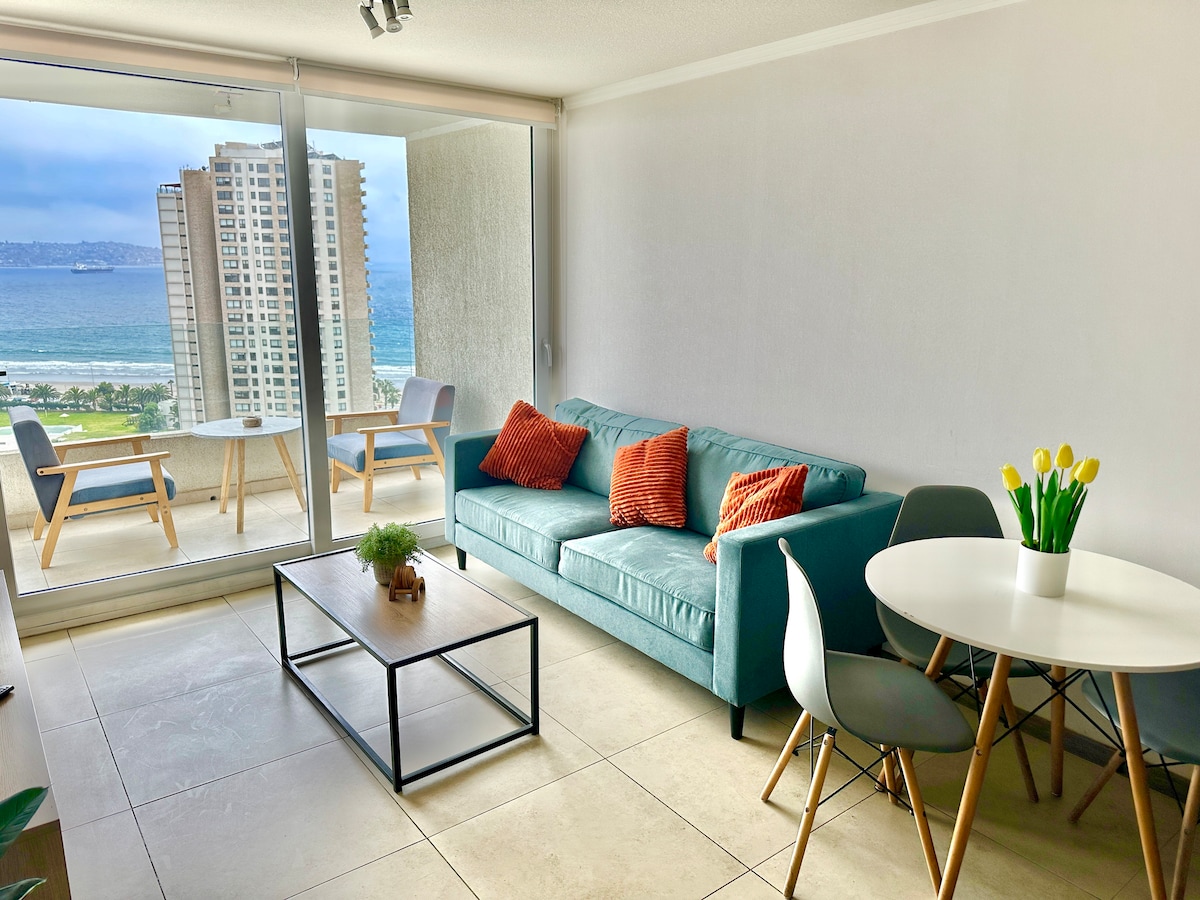 Hermoso departamento frontal primera línea, de la terraza una vista a toda la Avenida del Mar y la playa. Piso 7, Estacionamiento, 2d 2b y 1 futón. Piso flotante nuevo, cocina americana, TV, Wi Fi, Juegos de Mesa para jugar en familia y una linda hamaca en terraza. Equipamiento Edificio: Gimnasio, cancha de tenis, sala de pool, piscina, sauna, quincho, conserje 24/7, juegos para niño, áreas verdes, sala de eventos. Las camas cuentan con sábanas y cobertor. se dejan 2 toallas