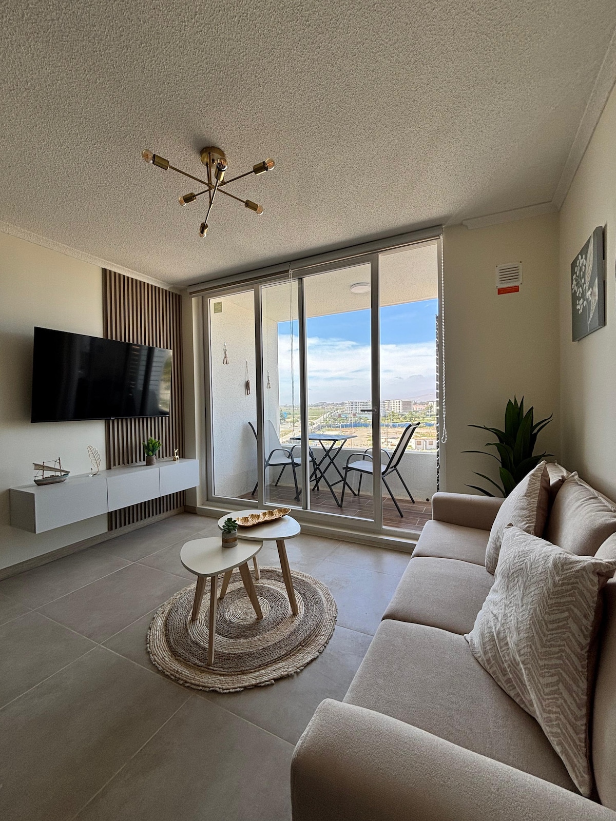 Hermoso departamento, con espectacular vista y ubicado en condominio Gran Marina a pasos de la playa y casino Enjoy. - Habilitado para 5 personas. - Completamente amoblado. - 2 dormitorios. - 2 baños. - Terraza - Tv por cable en dormitorio principal y living. - Internet. - Estacionamiento. - Condominio cuenta con acceso controlado. - Quinchos. - Piscina. - Amplias áreas verdes. - Lavandería. - A pasos de la playa. - Junto al casino Enjoy Nota: Toallas no incluidas.