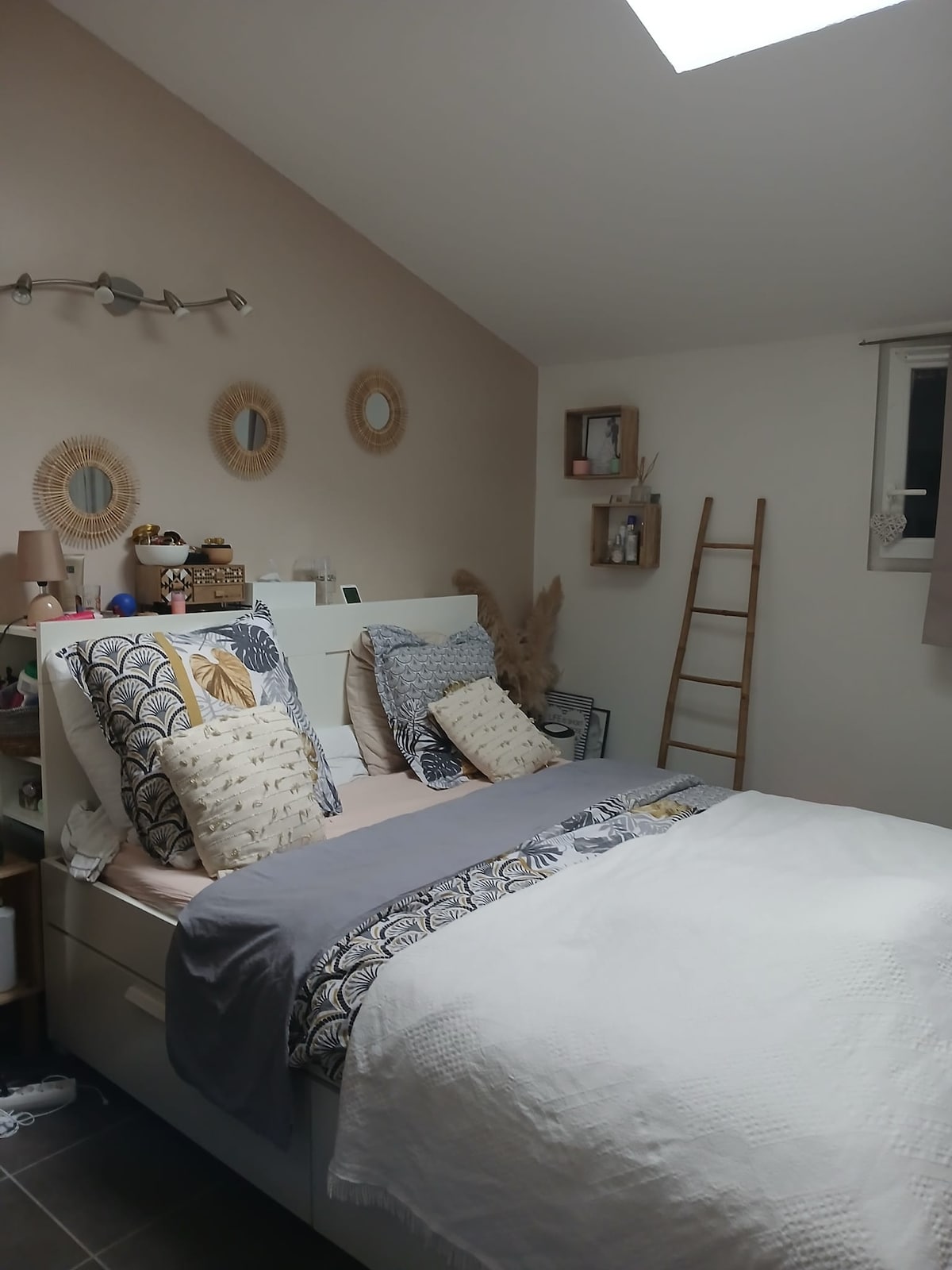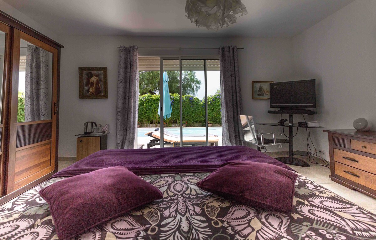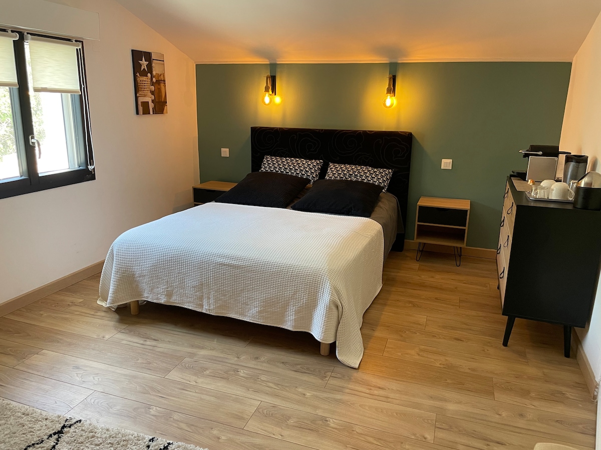 Nous proposons 2 chambres climatisées dans notre villa que nous partageons avec nos voyageurs en toute discrétion : 1 chambre à l’étage, lit de 140 (étage occupé uniquement par nos voyageurs) espace supplémentaire pour enfants à côté de la chambre parentale et 1 chambre mansardée, climatisée avec 1 grand lit de 140 pour ados ou adultes 2e chambre au RDC, lit de 160 pour adultes. Chaque chambre dispose de sa salle de bains privative. La réservation pour 2 pers privatise 1 seule chambre