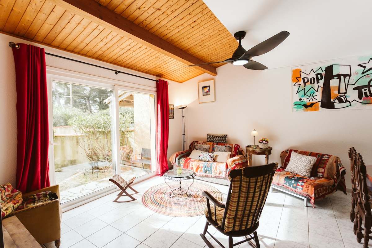 SIX-FOURS-LES-PLAGES - Villa NAYA Bienvenue dans notre maison rénovée (2024) style Bohème . Idéalement situé au calme à 20 min à pied du port de Sanary sur mer (plus beaux marché de France 2018) et 10 min à pied de la plage de Bonnegrâce. Pouvant accueillir jusqu'à 6 personnes maximum cette villa entièrement équipée et climatisée possède 3 chambres avec lit double ,une cuisine ouverte sur le salon donnant sur un jardin bien exposé avec une belle piscine (hors sol) Wifi (fibre), BBQ et parking