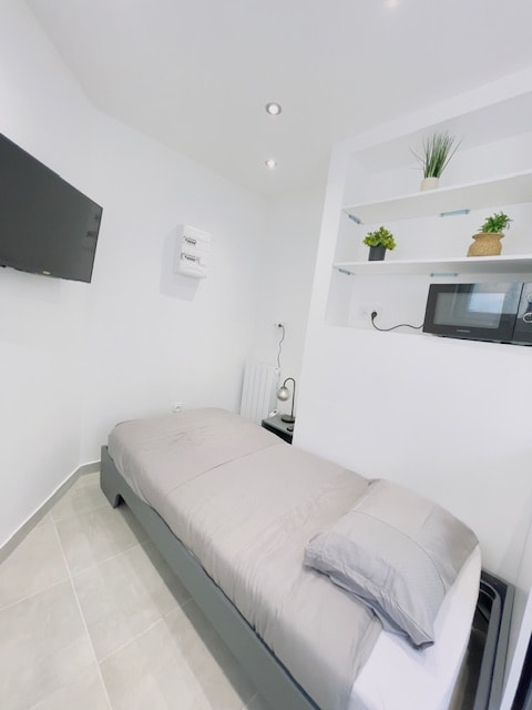 Studio with kitchenette, shower and toilet, double bed, quiet and cozy. Located in the center of the village near the shops and the Sarthe. Independent entrance with stairs. Access to a shared garden and terrace. Four restaurants accessible by foot as well as a small supermarket, two bakeries, three banks, a cellar, a pharmacy and two bars.